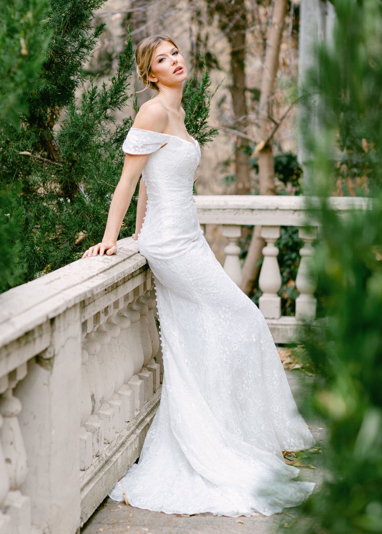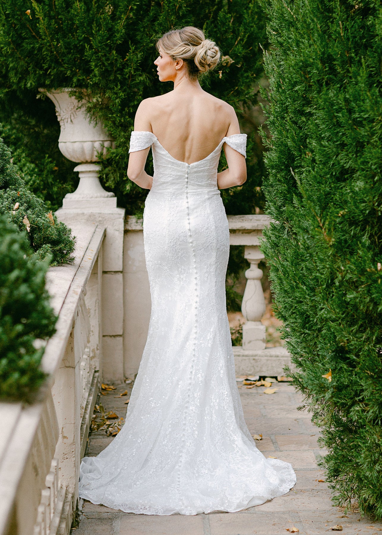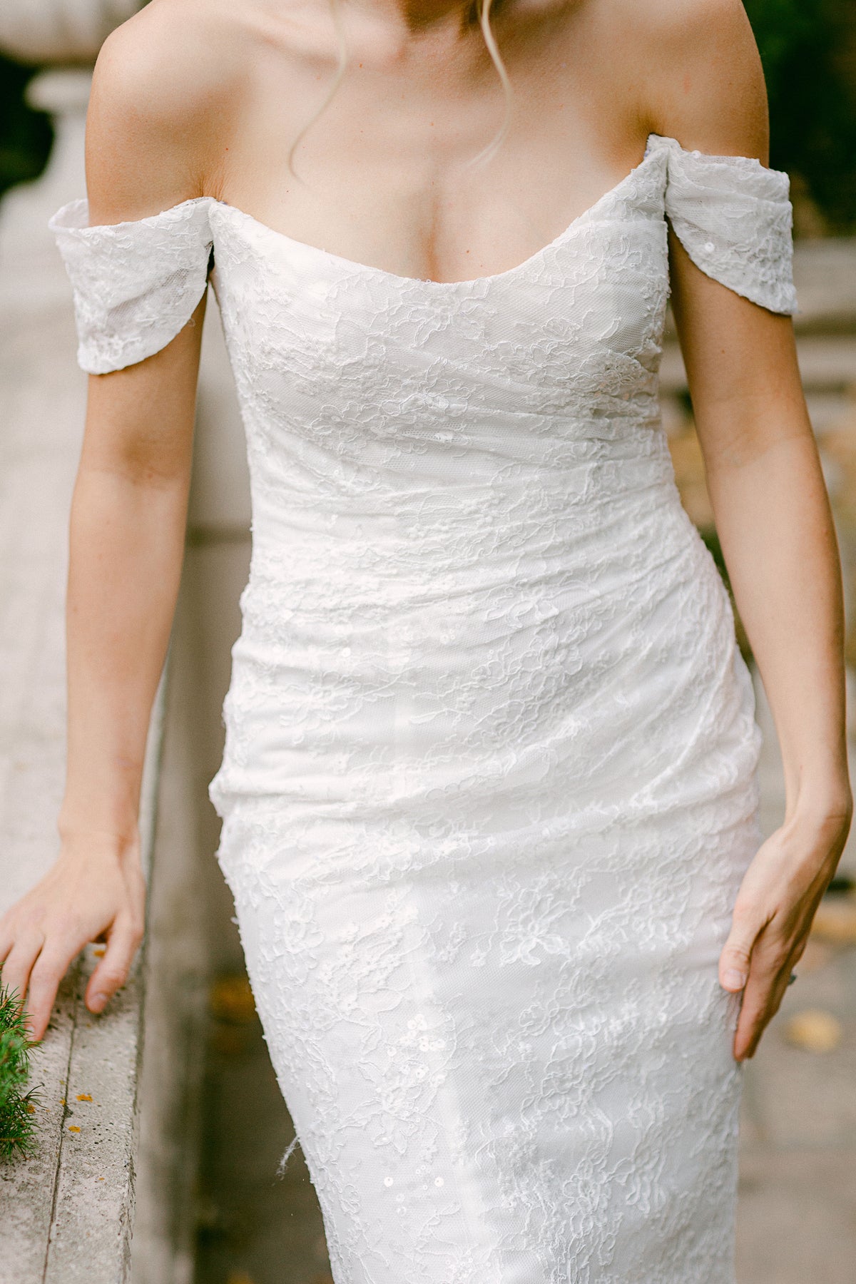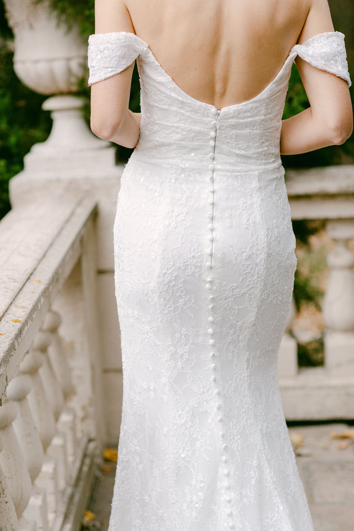 Cunningham is a figure hugging fitted gown that features a cat eye a ruched bodice and off-the-shoulder straps. She is made of a embroidered lace with sequins and is designed with buttons down the length of the train.