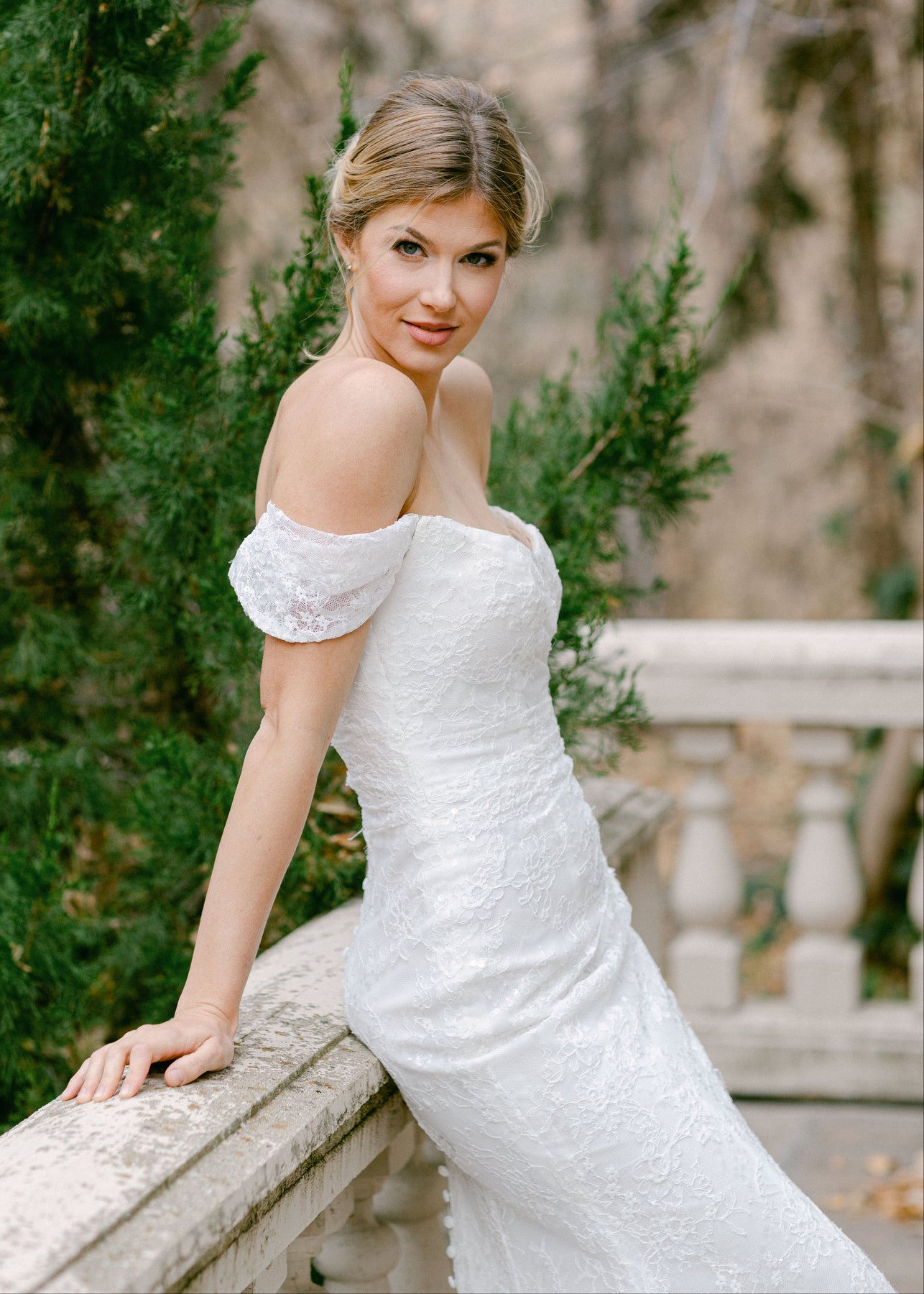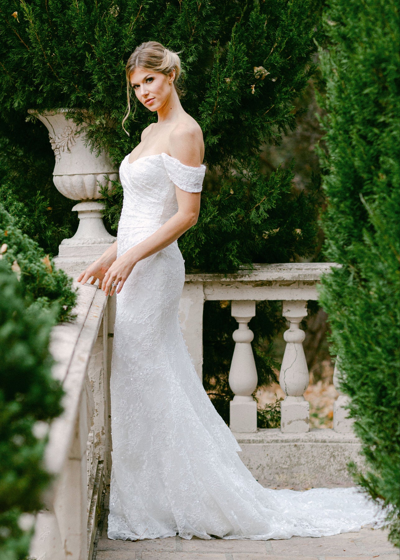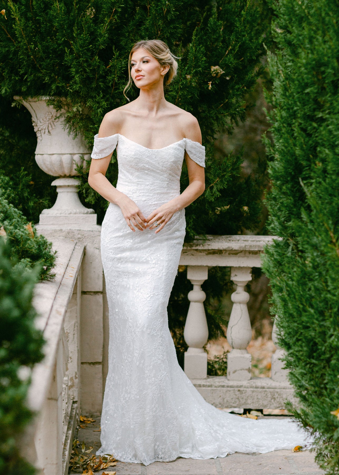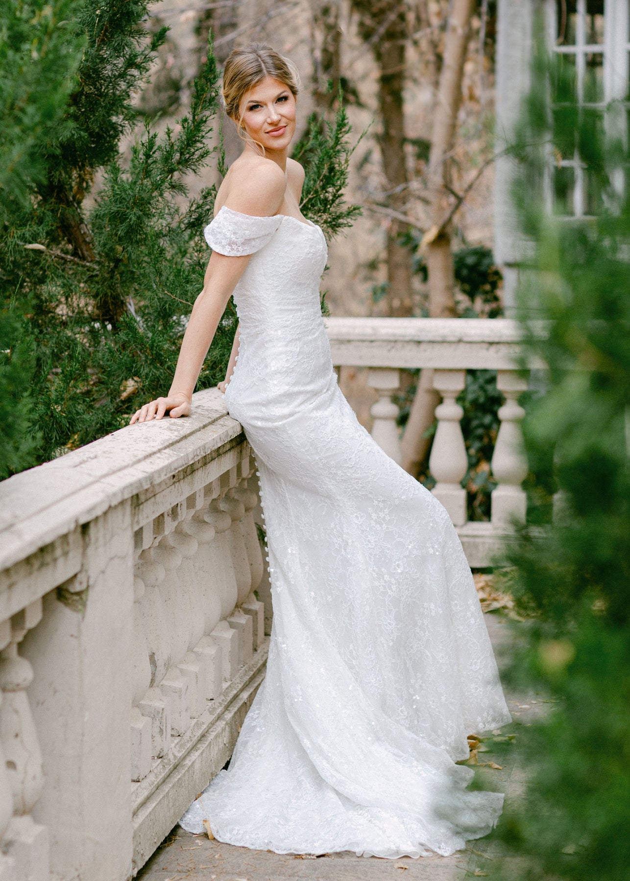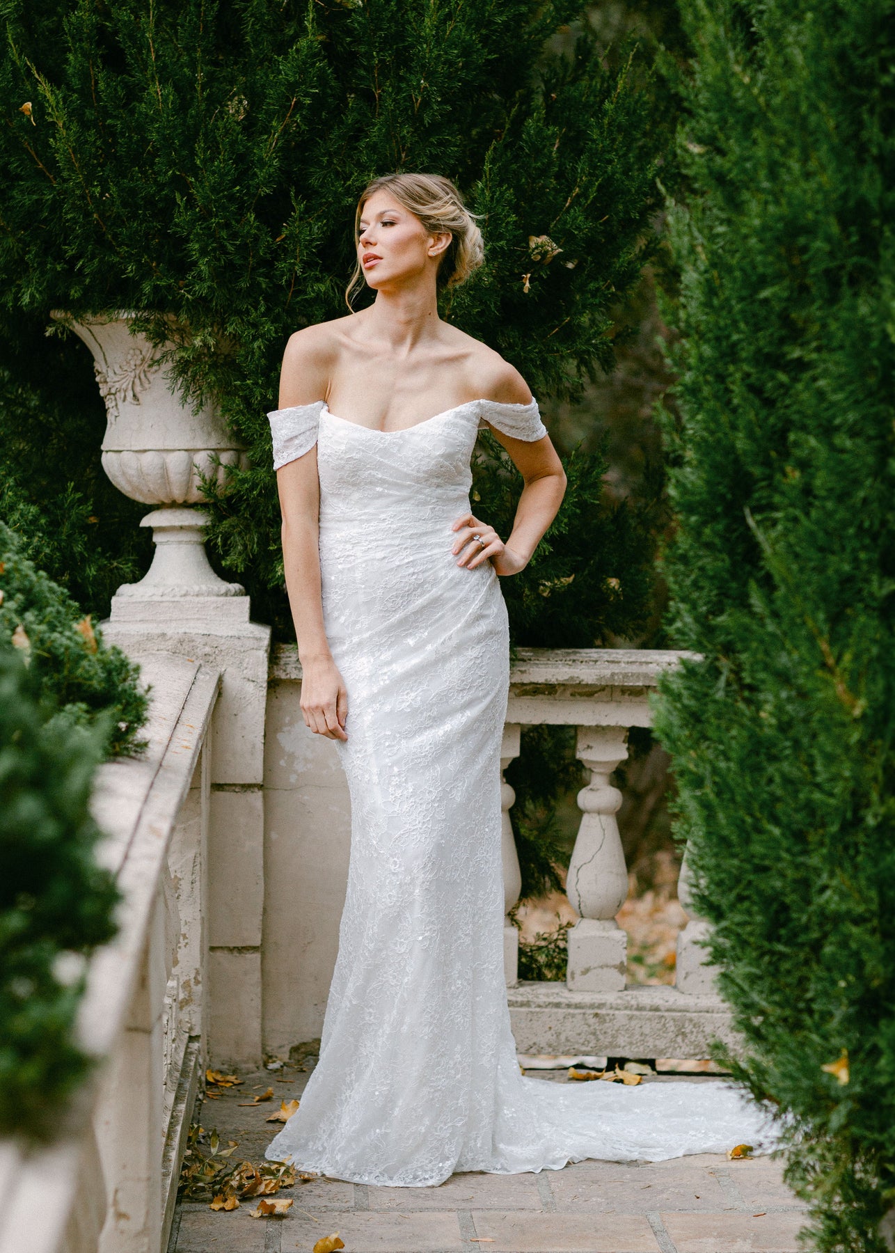 Cunningham is a figure hugging fitted gown that features a cat eye a ruched bodice and off-the-shoulder straps. She is made of a embroidered lace with sequins and is designed with buttons down the length of the train.