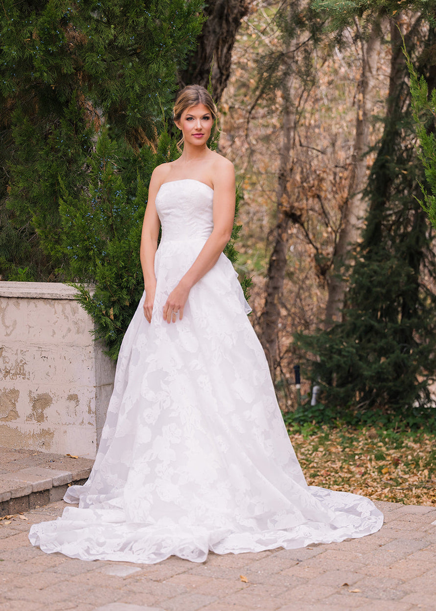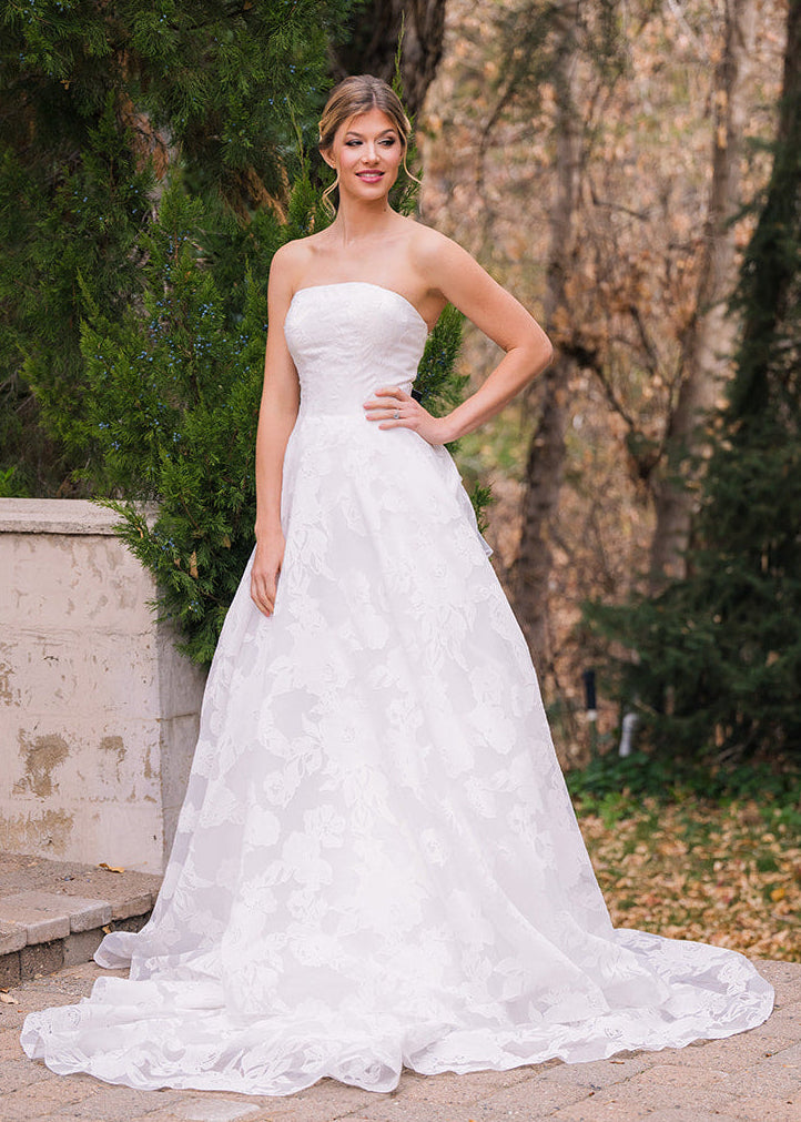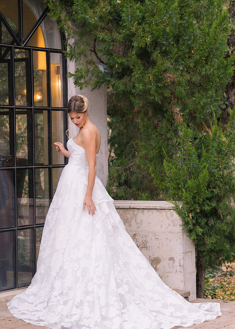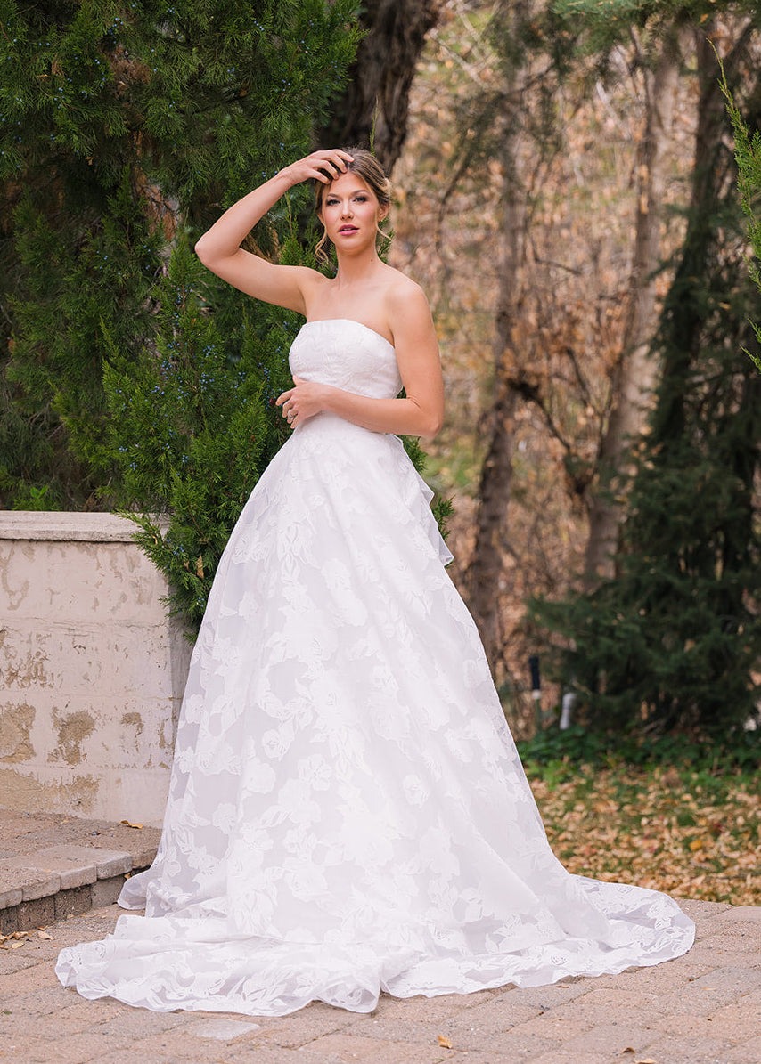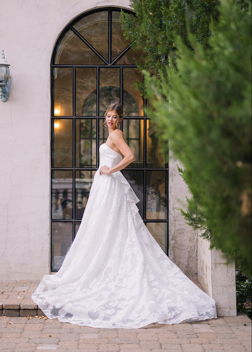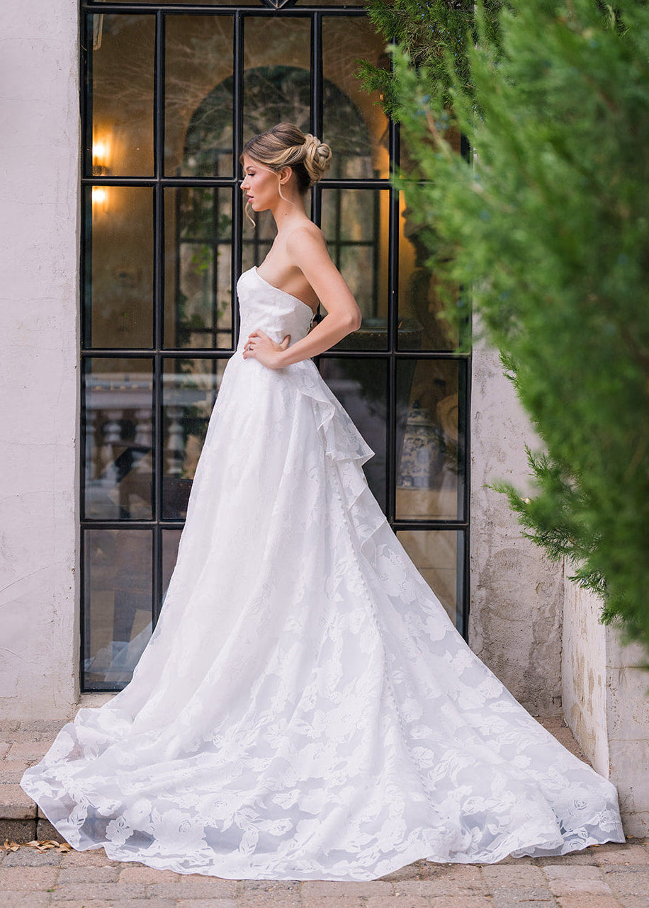 Abbott is an elegant strapless gown that features a clean, structured bodice paired with a full A-line skirt designed with a soft floral embossed organza. This timeless silhouette creates a flattering shape, while the flowing skirt adds movement and romance. Abbott features a removable asymmetric ruffle bow and buttons down the length of her train.ย