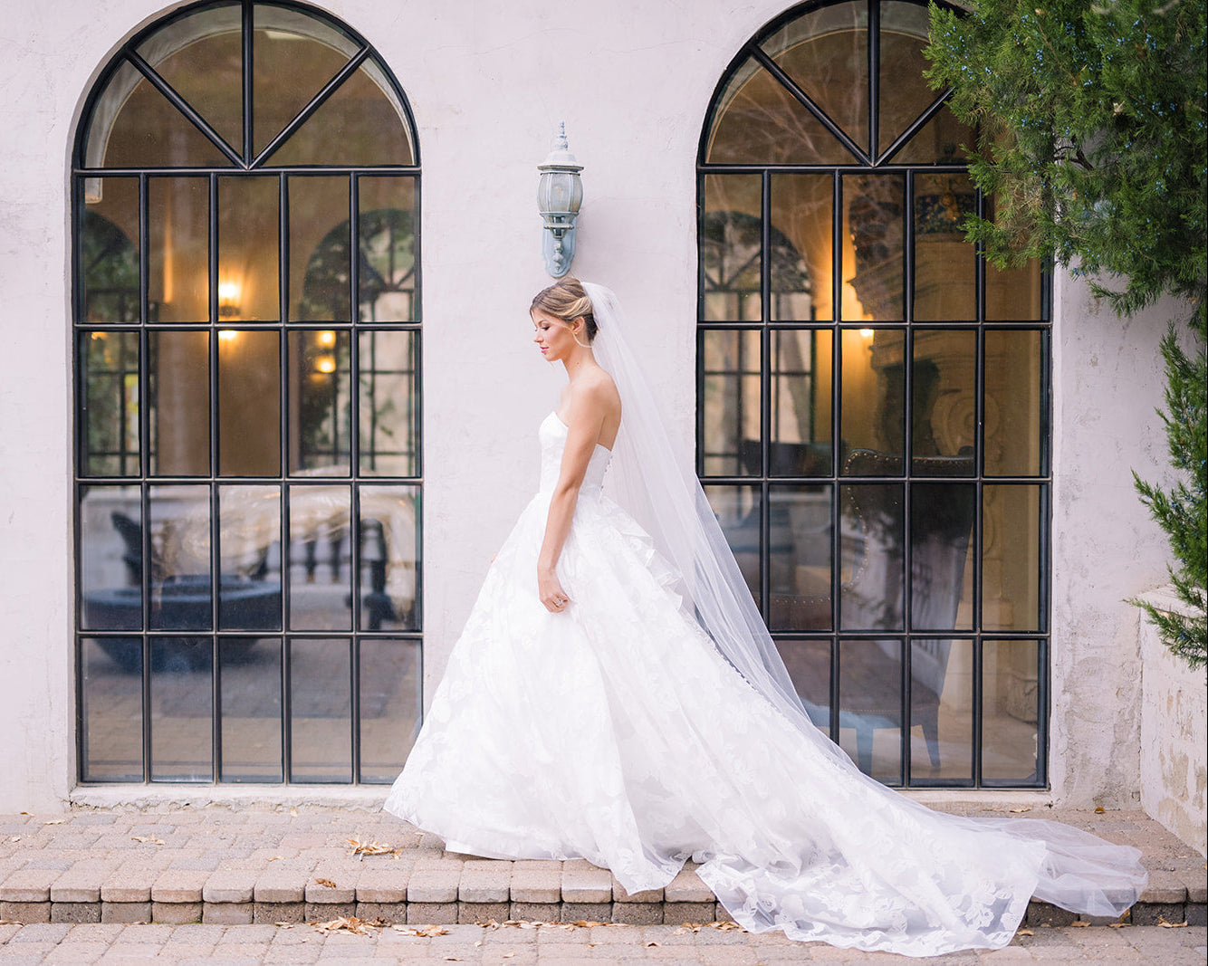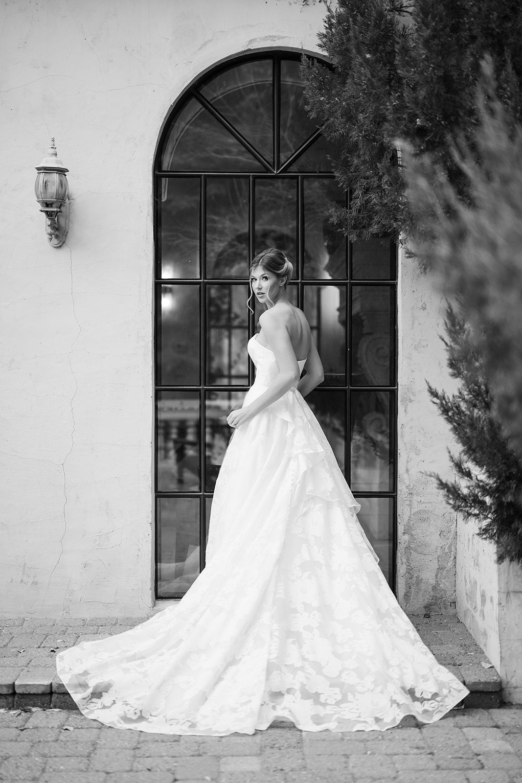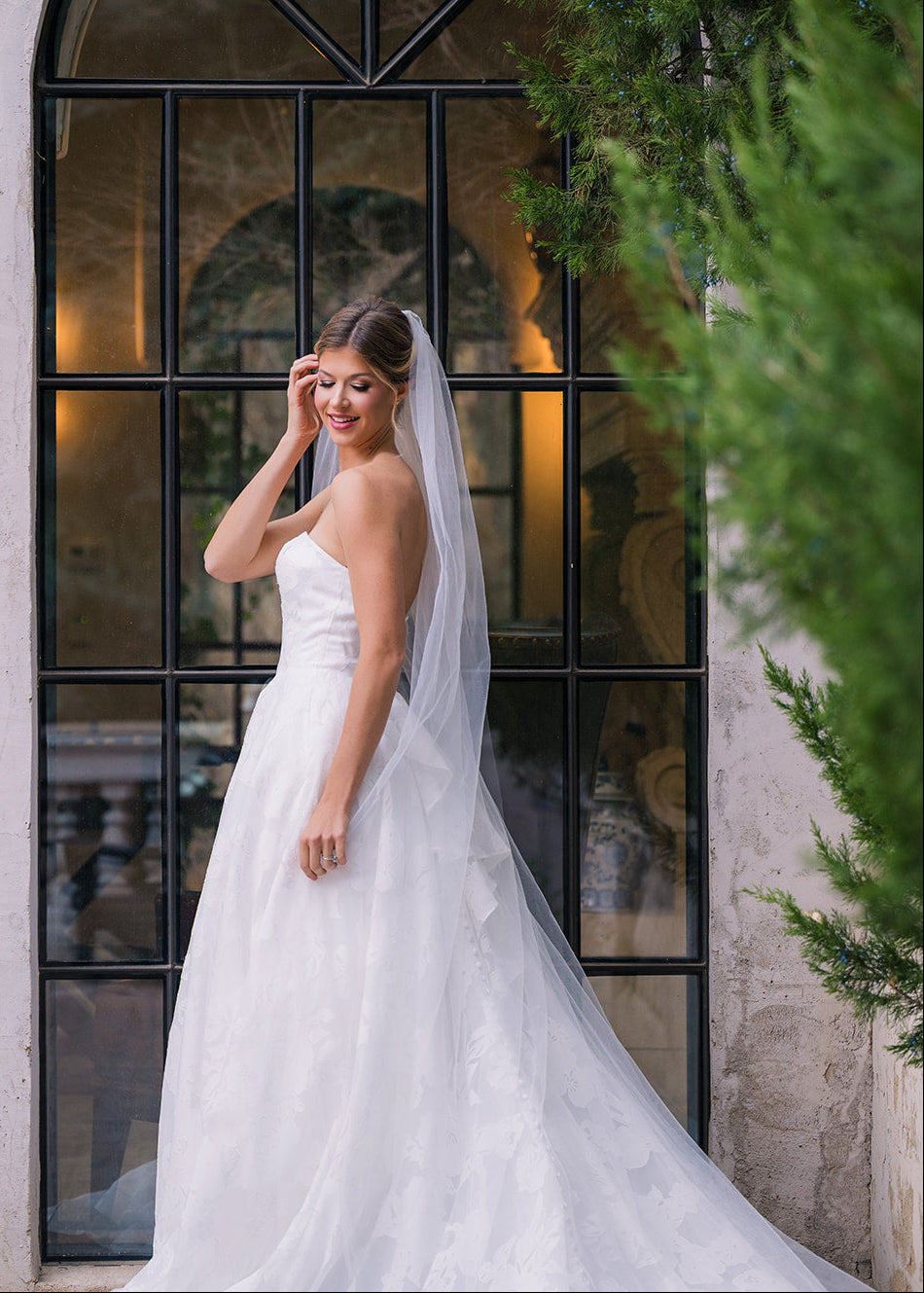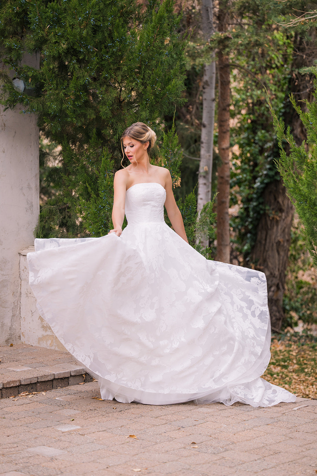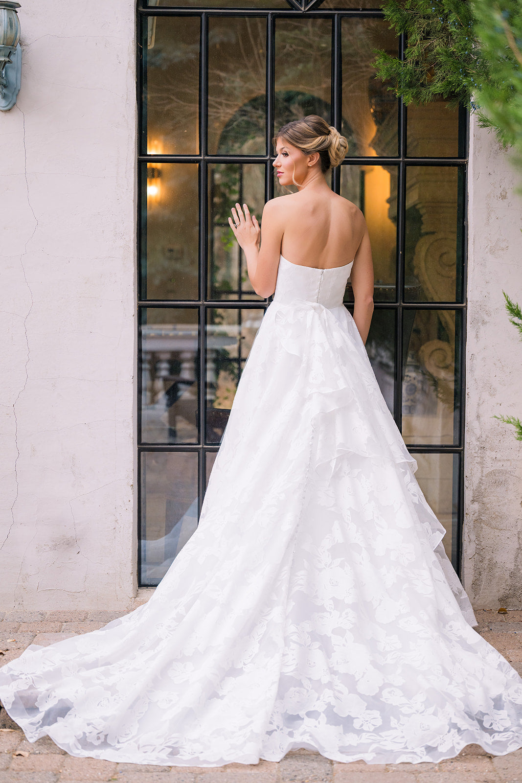 Abbott is an elegant strapless gown that features a clean, structured bodice paired with a full A-line skirt designed with a soft floral embossed organza. This timeless silhouette creates a flattering shape, while the flowing skirt adds movement and romance. Abbott features a removable asymmetric ruffle bow and buttons down the length of her train.ย