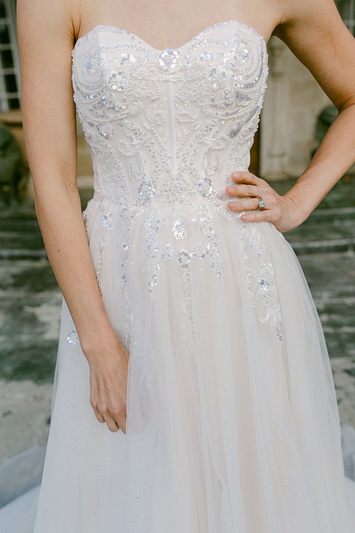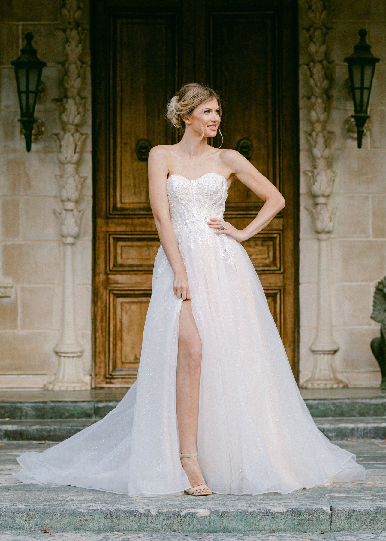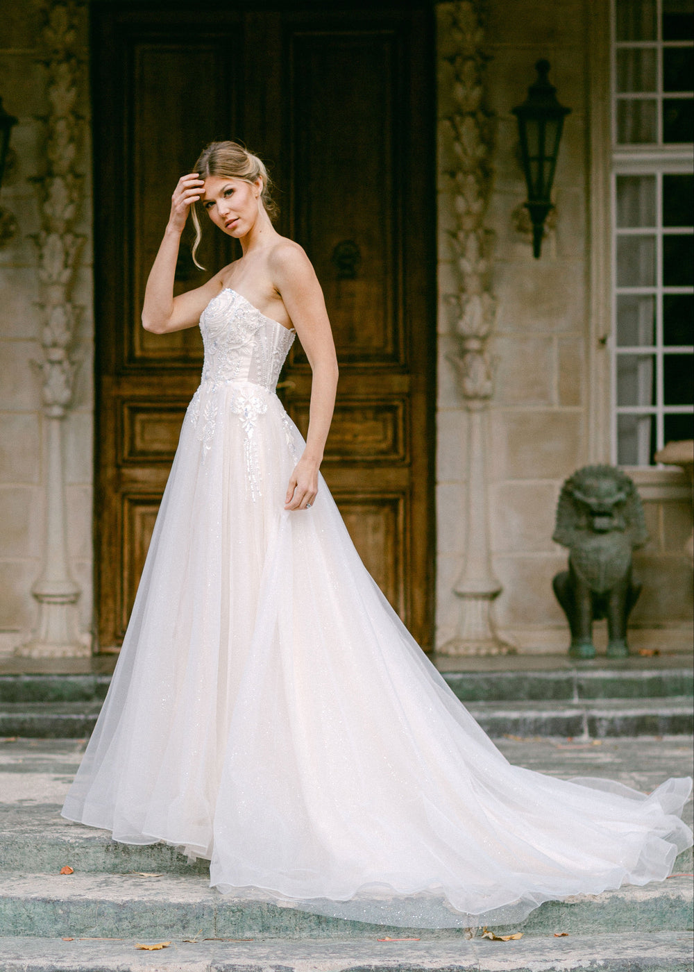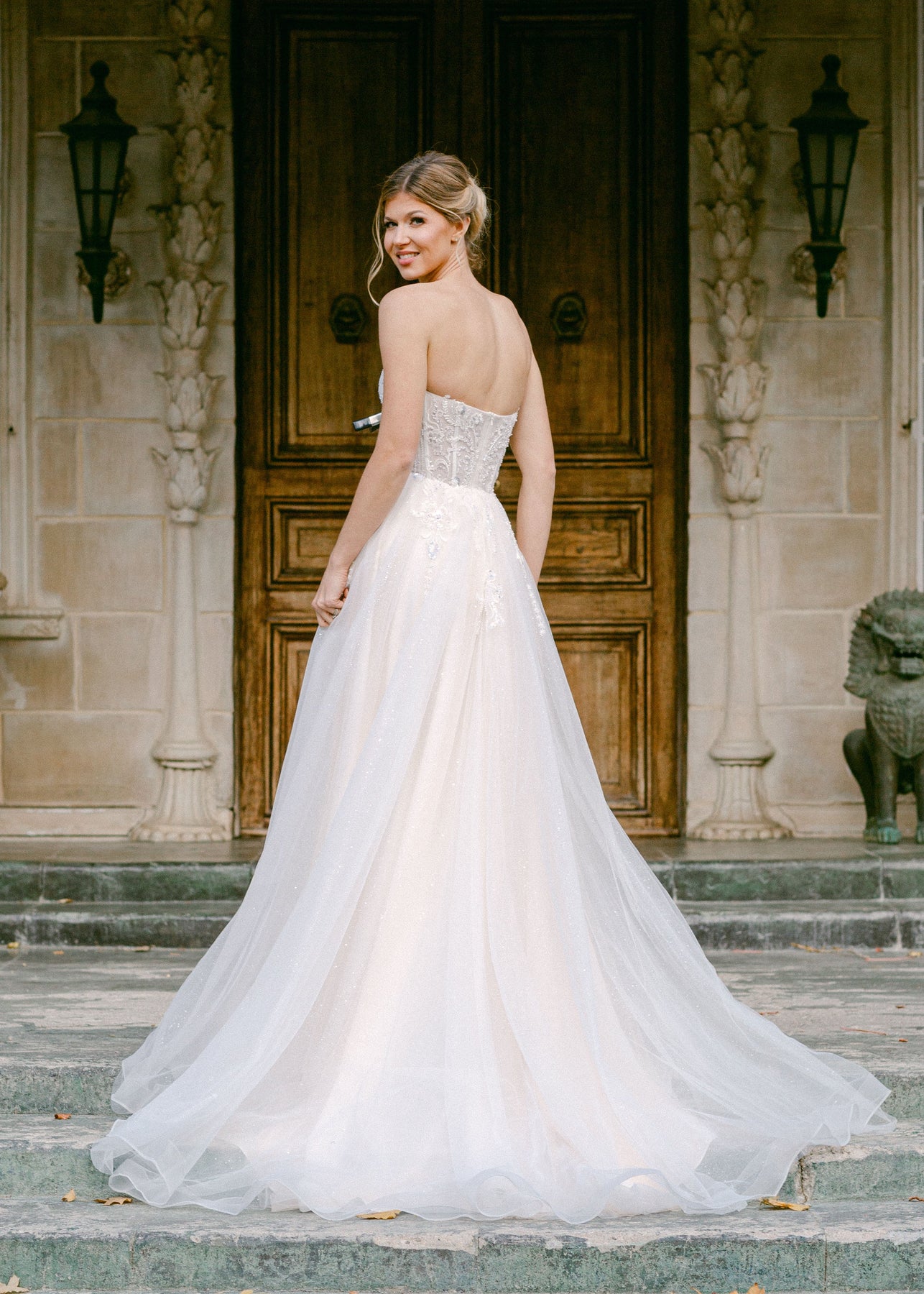 Lockhart is figure flattering full A-line silhouette made of glitter tulle for the perfect amount of sparkle. She features a fitted sweetheart bodice adorned with show stopping beading, an alluring slit, an open back and covered buttons down the length of the train.