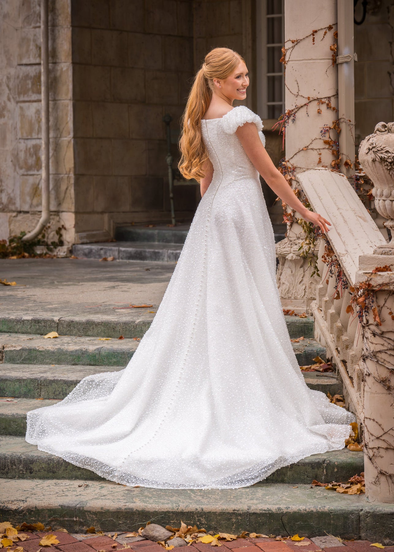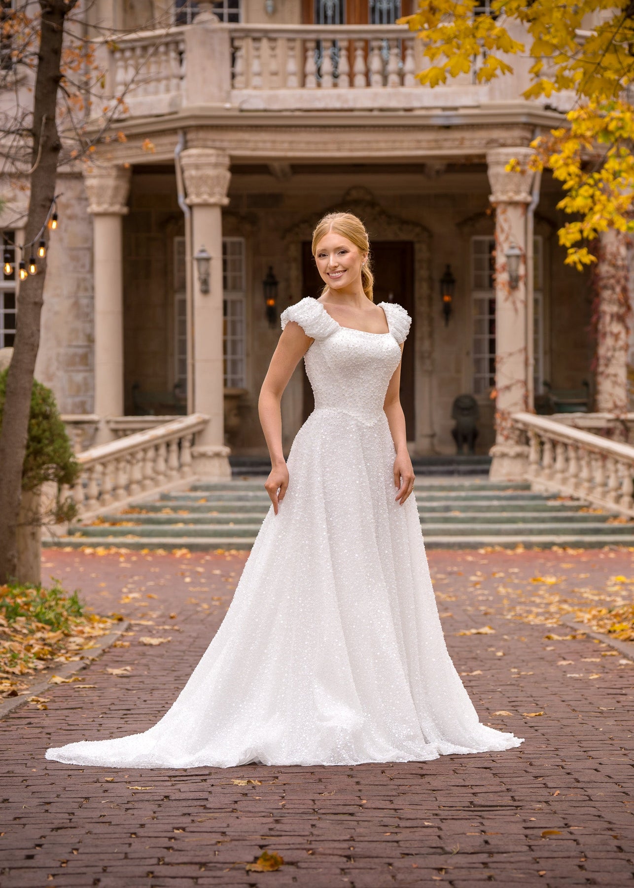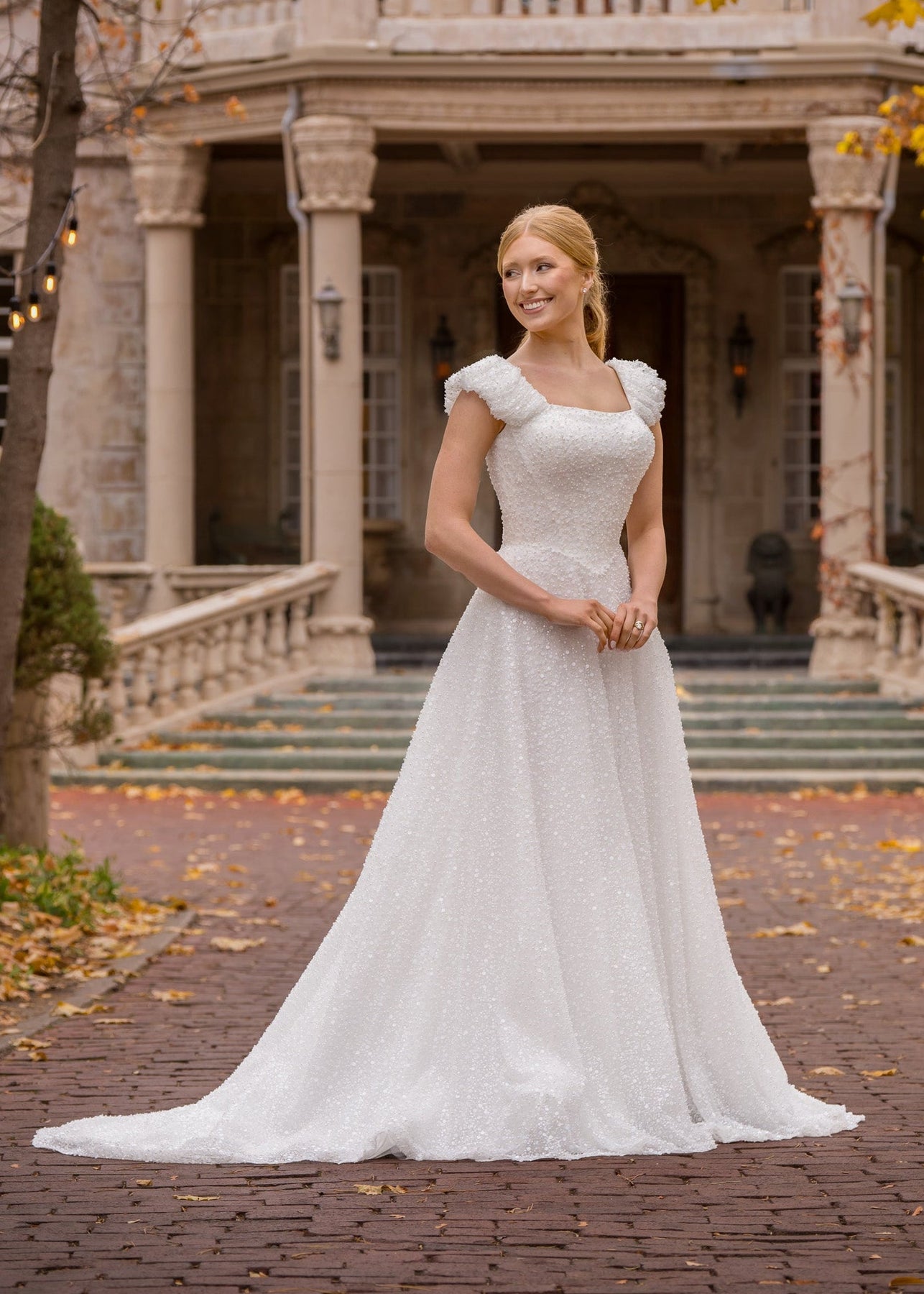 Angelina is an elegant A-line silhouette gown designed with a stunning sequin fabric that will have you shimmering on your special day. She features a modest wide square neckline, ruched cap sleeves, a fitted basque waist, exposed boning along the bodice and pearl buttons down the length of her train.