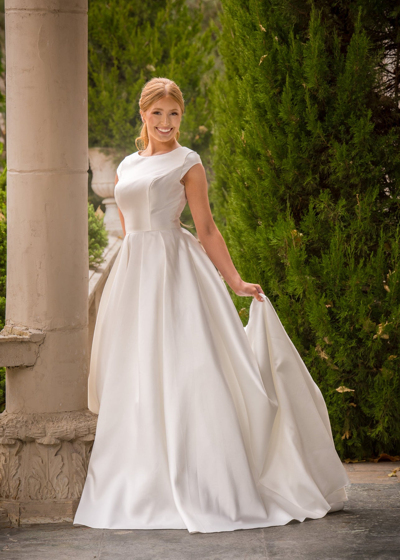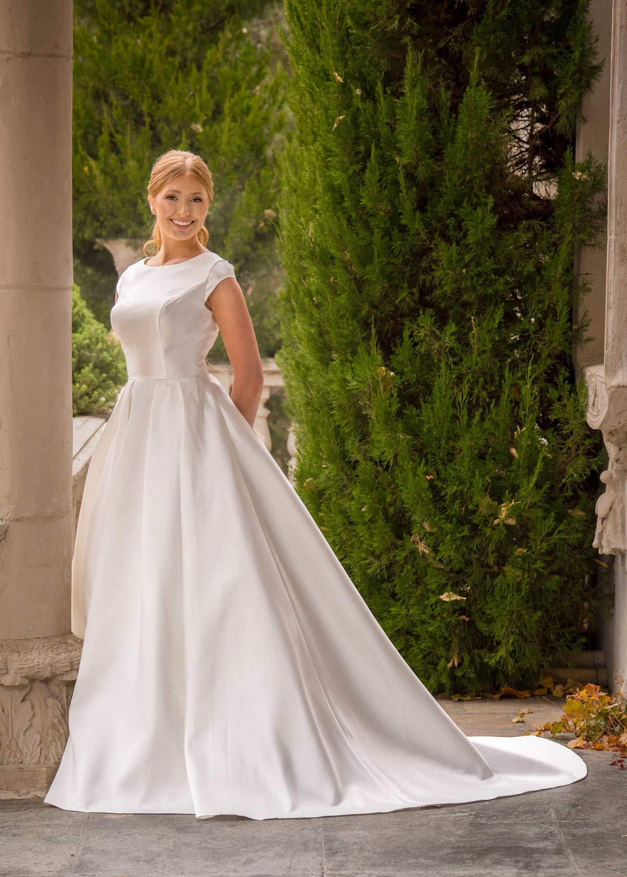 Belinda is a ballgown silhouette made of Mikado with pockets and buttons down the train. She features a scoop bateau neckline and cap sleeves. Fabric: MikadoAvailable colors: Ivory, WhiteDress color in photographs: Ivory Find A Location To Buy