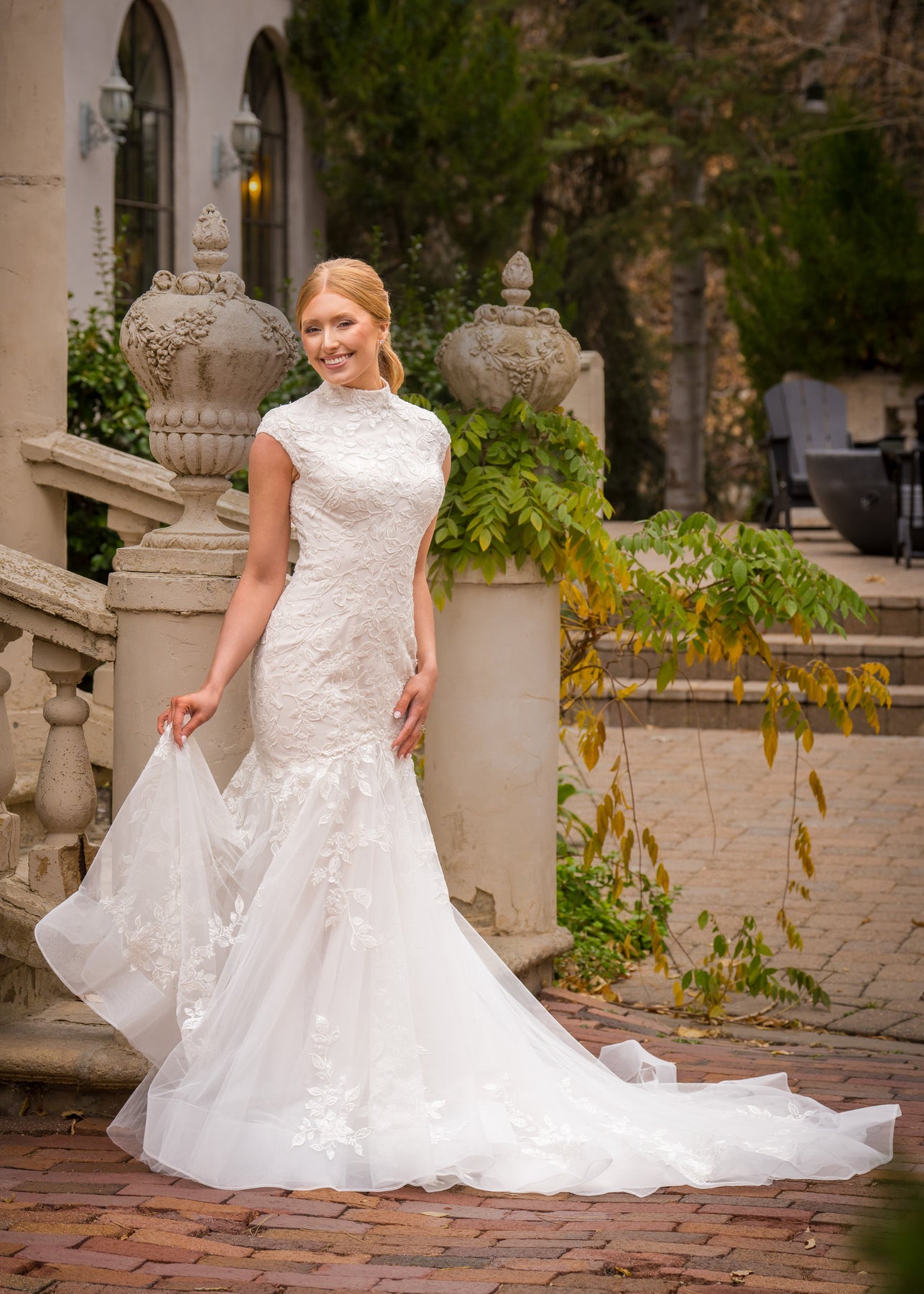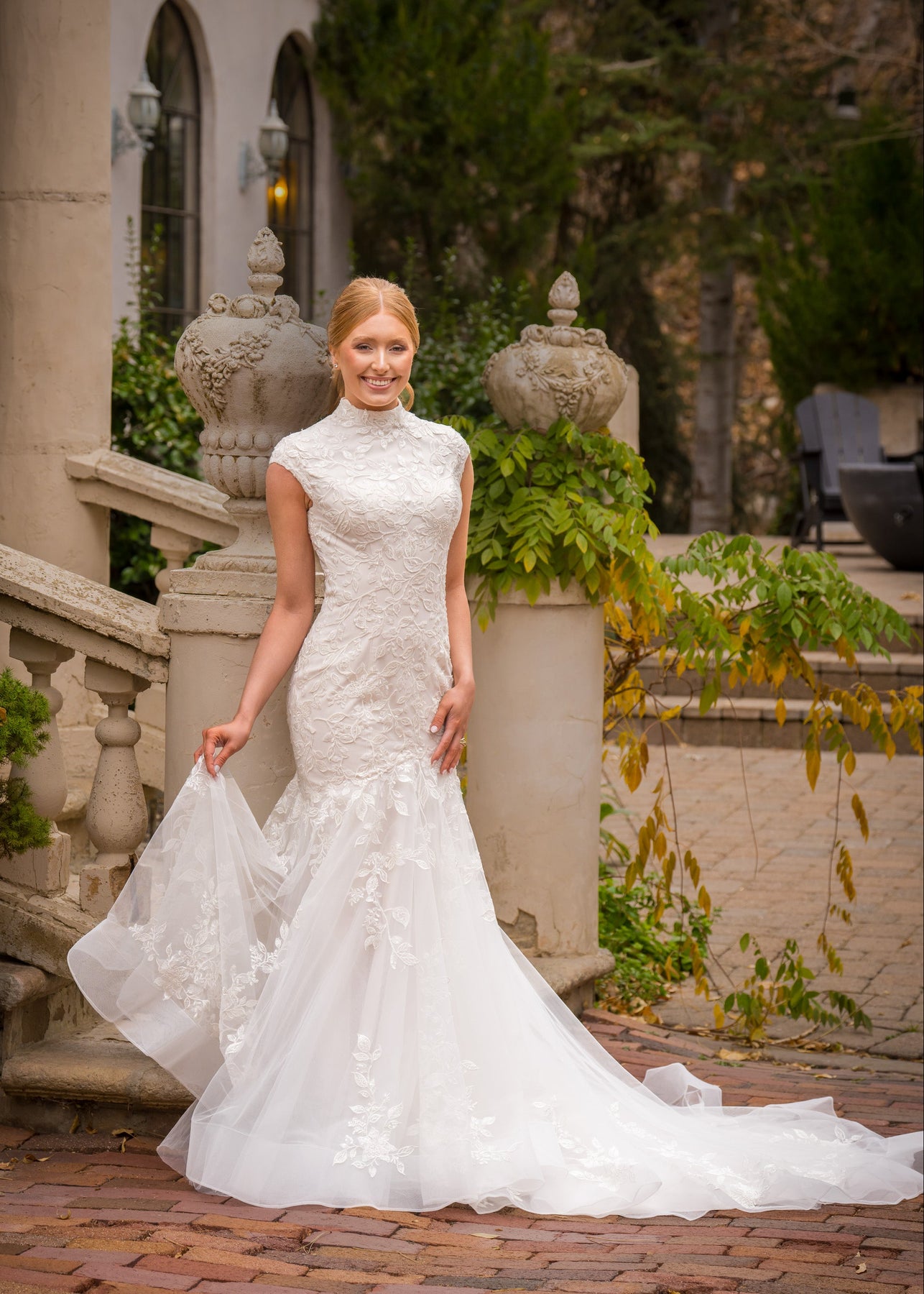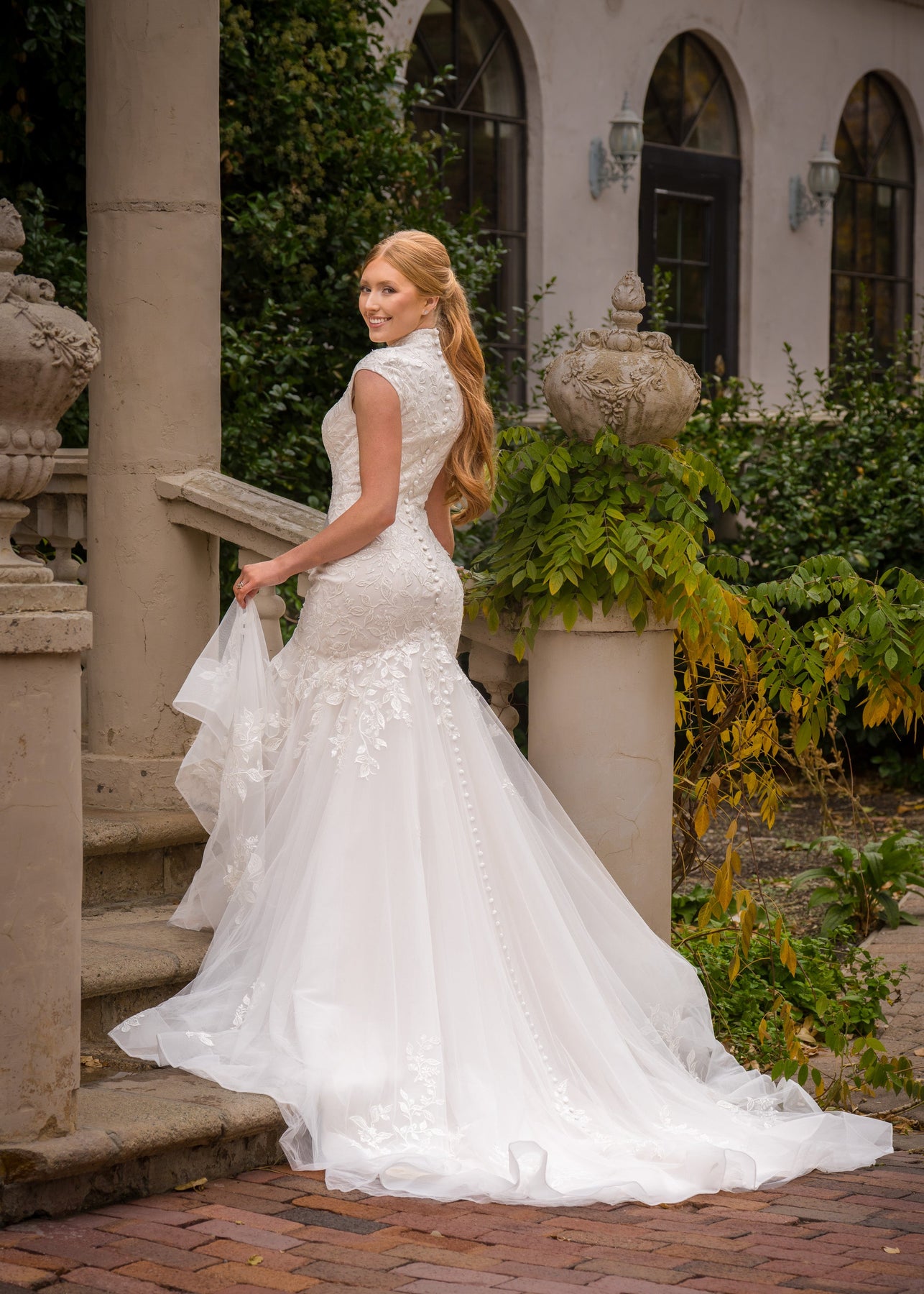 Bianca is a fitted silhouette made of tulle, lovely lace appliques covered in flat sequins and long illusion sleeves. She features a modest mock neckline and dramatic lace train with buttons to the end.