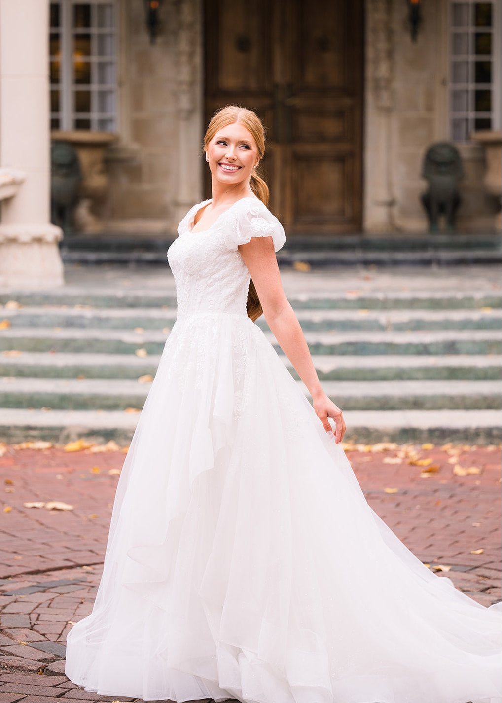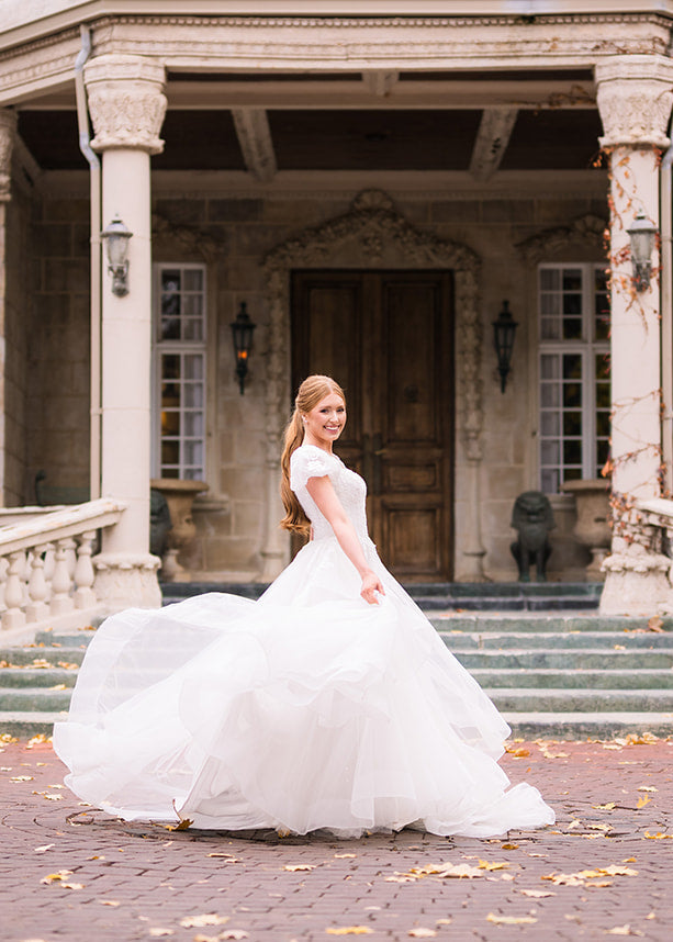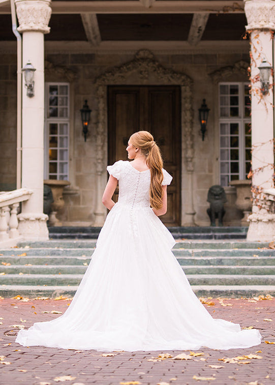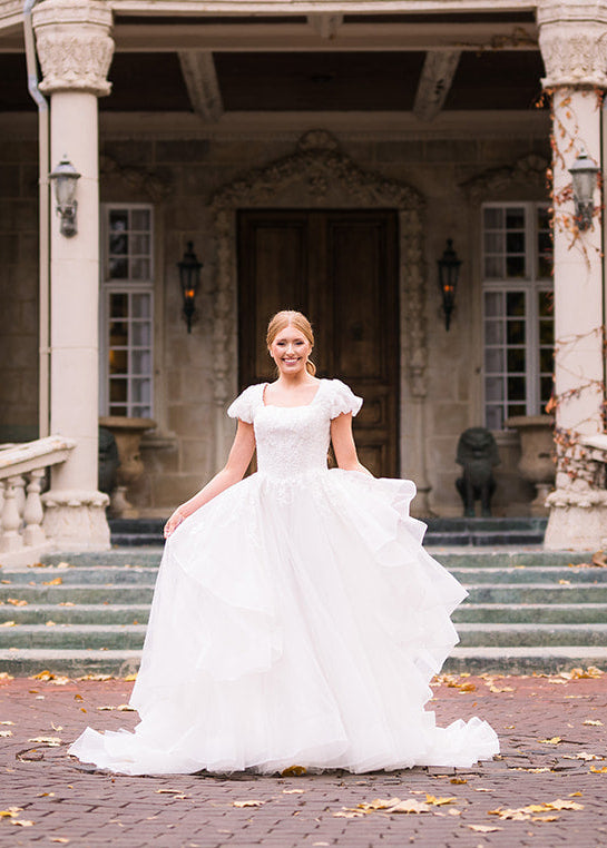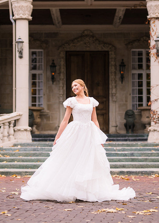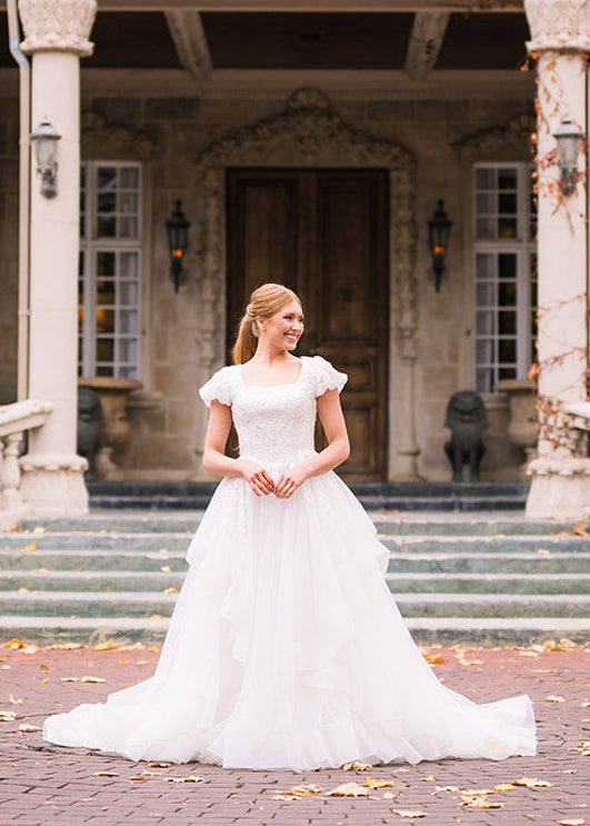 Elizabeth is a romantic ballgown fit for a princess. She features a modest soft square neckline that showcases an intricately beaded bodice with a subtle basque waist. The lace flows onto a stunning layered horse hair ribboned skirt with buttons down the length of the train.