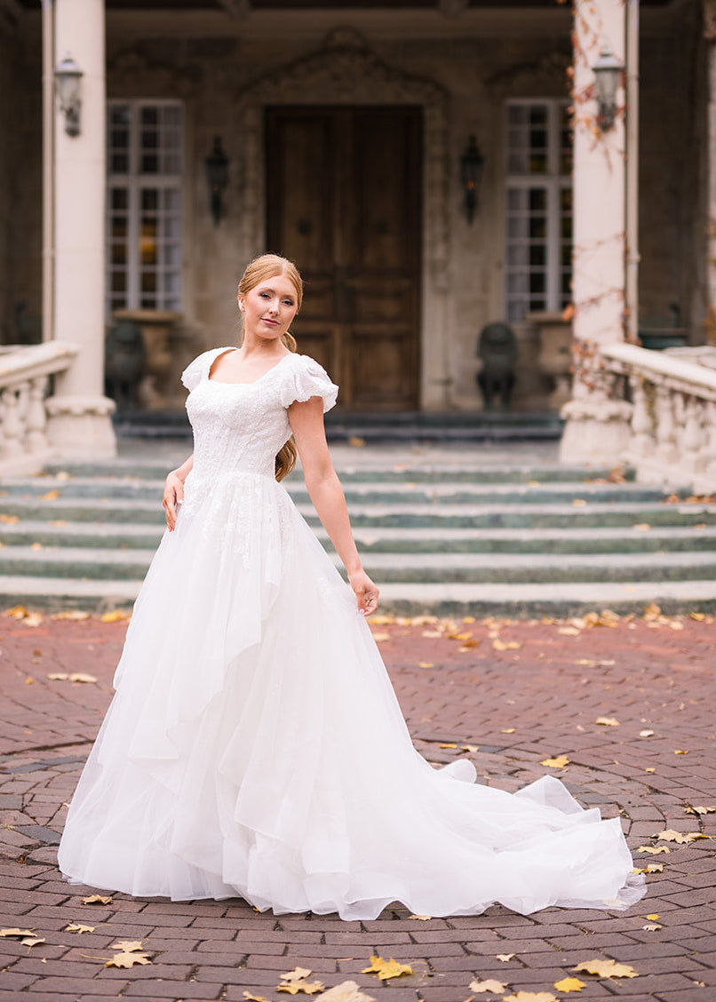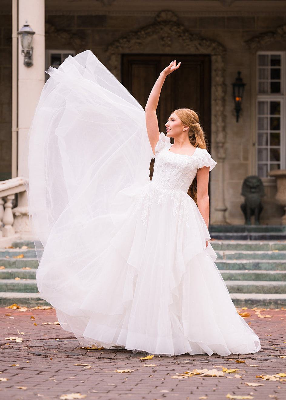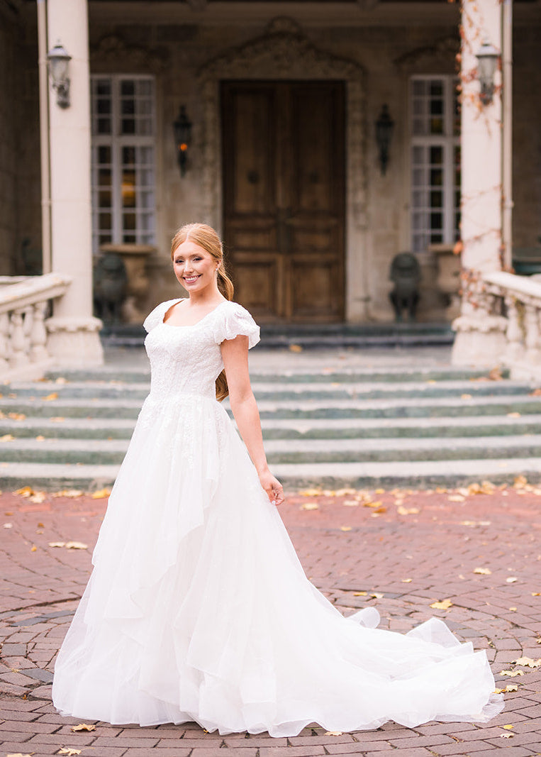 Elizabeth is a romantic ballgown fit for a princess. She features a modest soft square neckline that showcases an intricately beaded bodice with a subtle basque waist. The lace flows onto a stunning layered horse hair ribboned skirt with buttons down the length of the train.