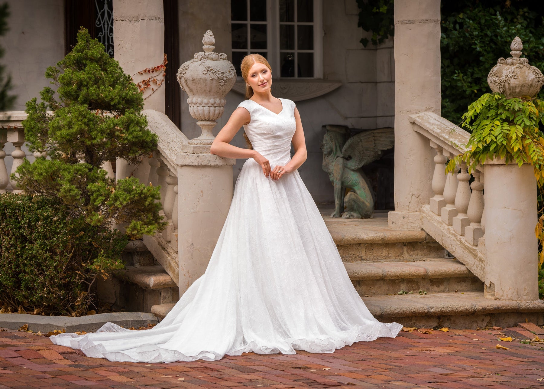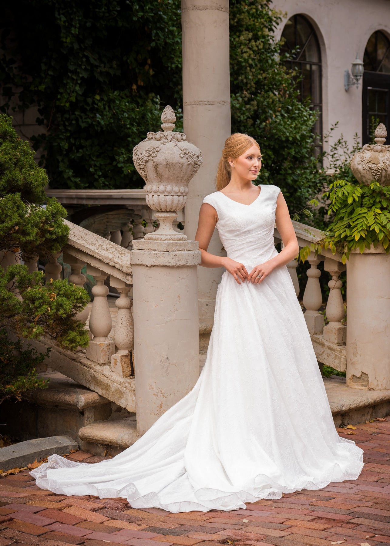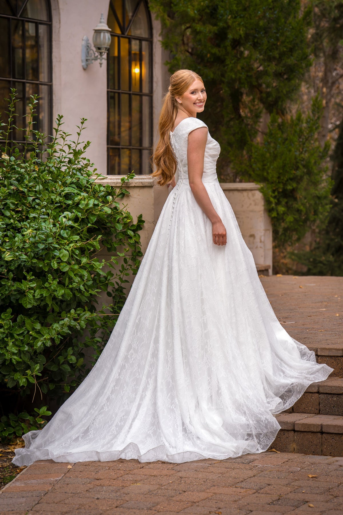 Hope is a romantic full ball gown made of the softest Chantilly lace. She features a basque waist, modest wide v-neckline, asymmetrical ruching along the bodice and cap sleeves. Her full skirt ends with pearl button downs the length of a dramatic train.