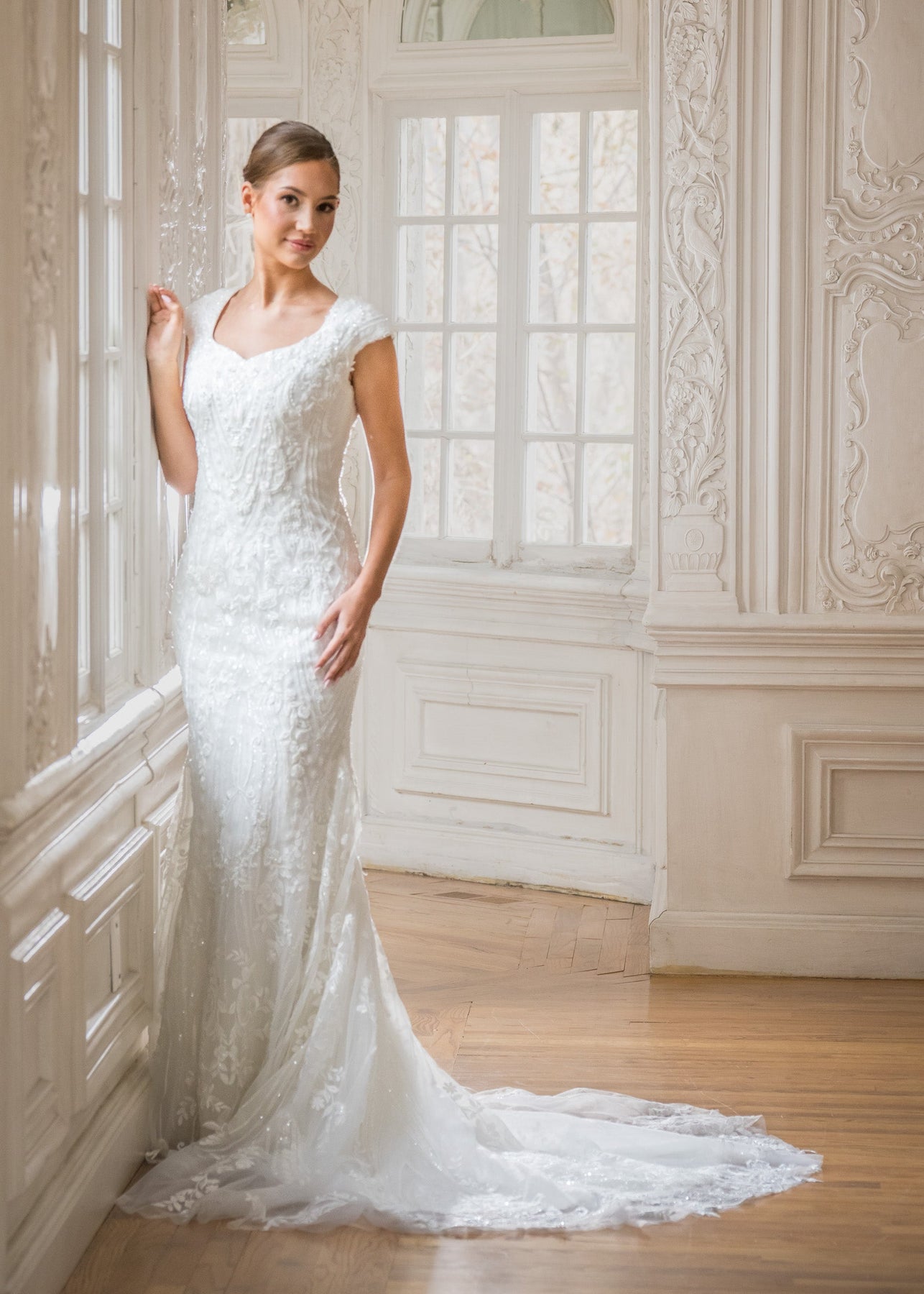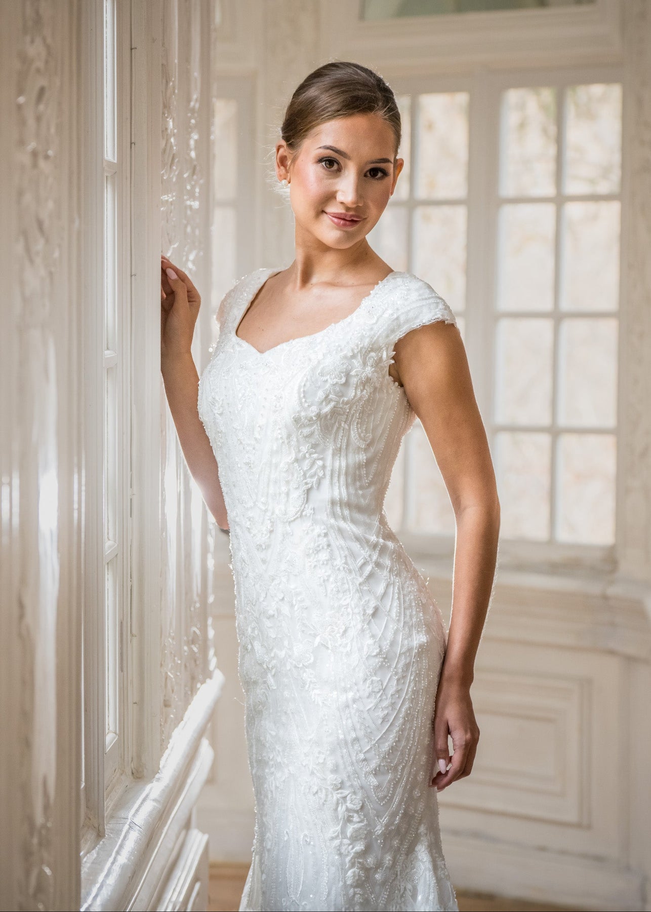 Lola is the stunning, fully beaded wedding dress of your dreams. She features a figure flattering fitted silhouette, a modest soft sweetheart neckline, cap sleeves and a dramatic lace train. Fabric: Beaded Tulle Available colors: Ivory, Ivory/SandDress color in photographs: Ivory Find A Location To Buy