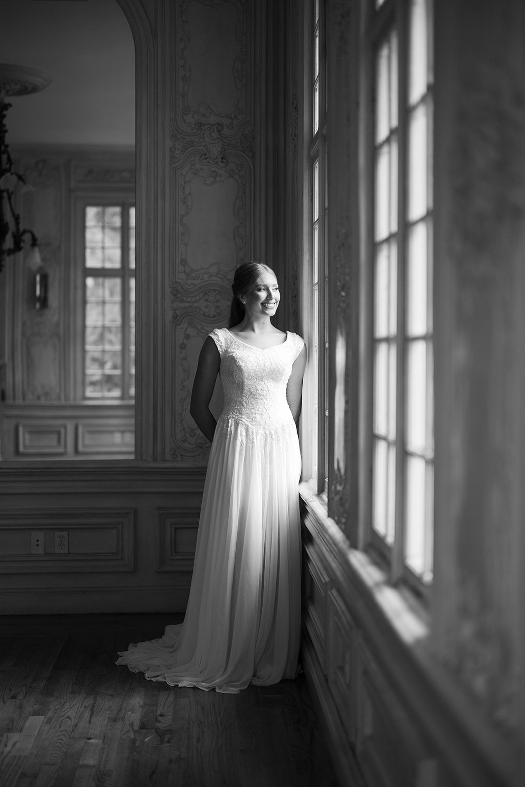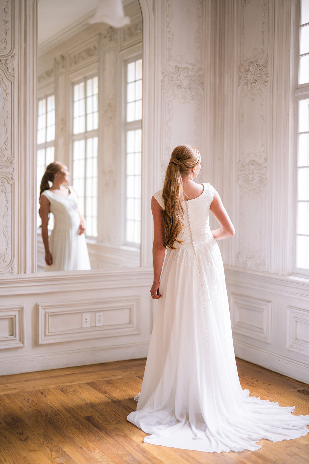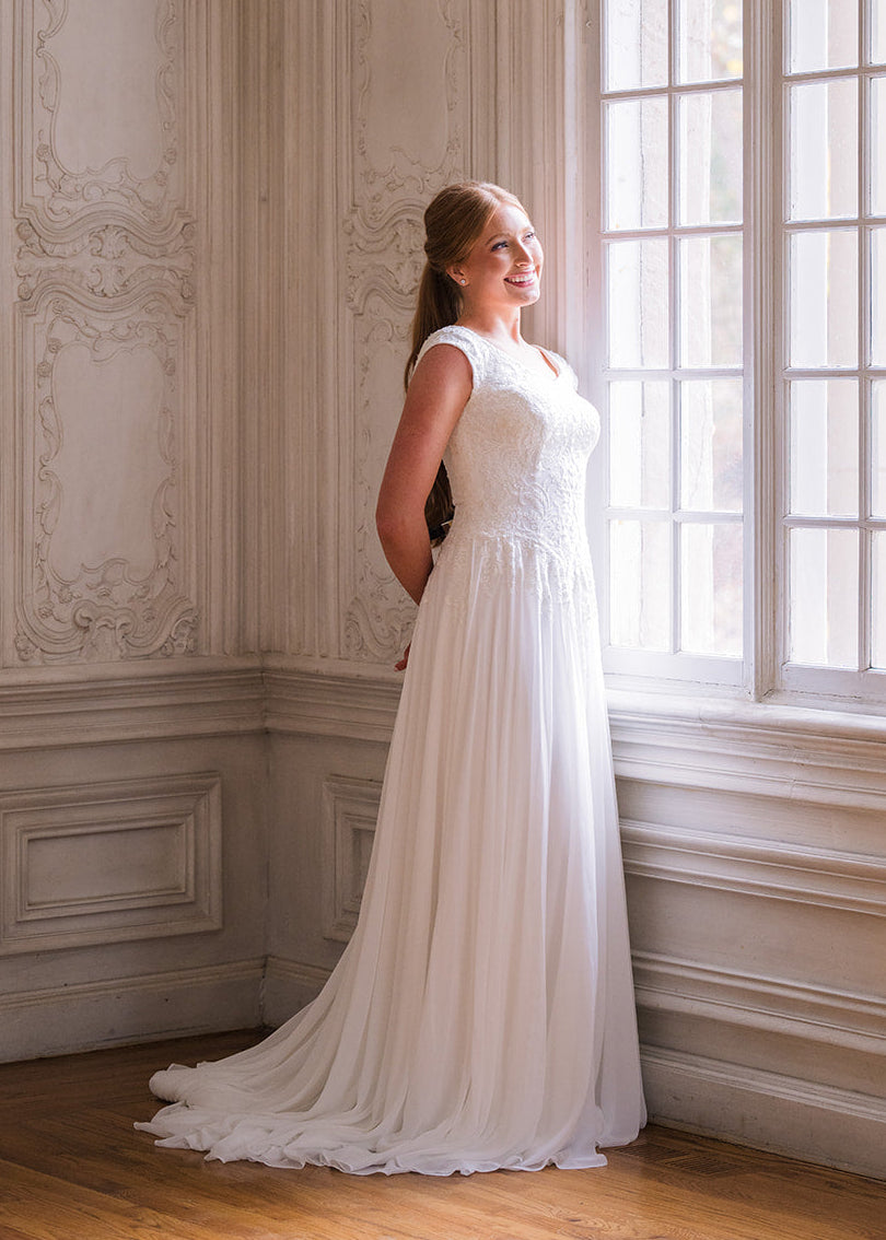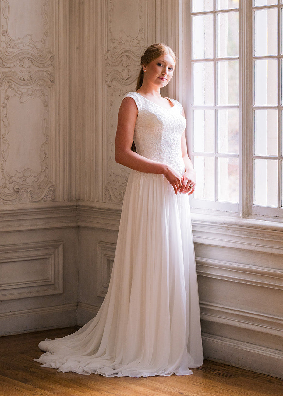 Luna is a flowing a-line silhouette made of chiffon and adorned with lace on the bodice trailing into the top of the skirt and on the cap sleeves. She features a wide v-neck and buttons down the train. Fabric: Chiffon and LaceAvailable colors: Ivory, WhiteDress color in photographs: Ivory Find A Location To Buy