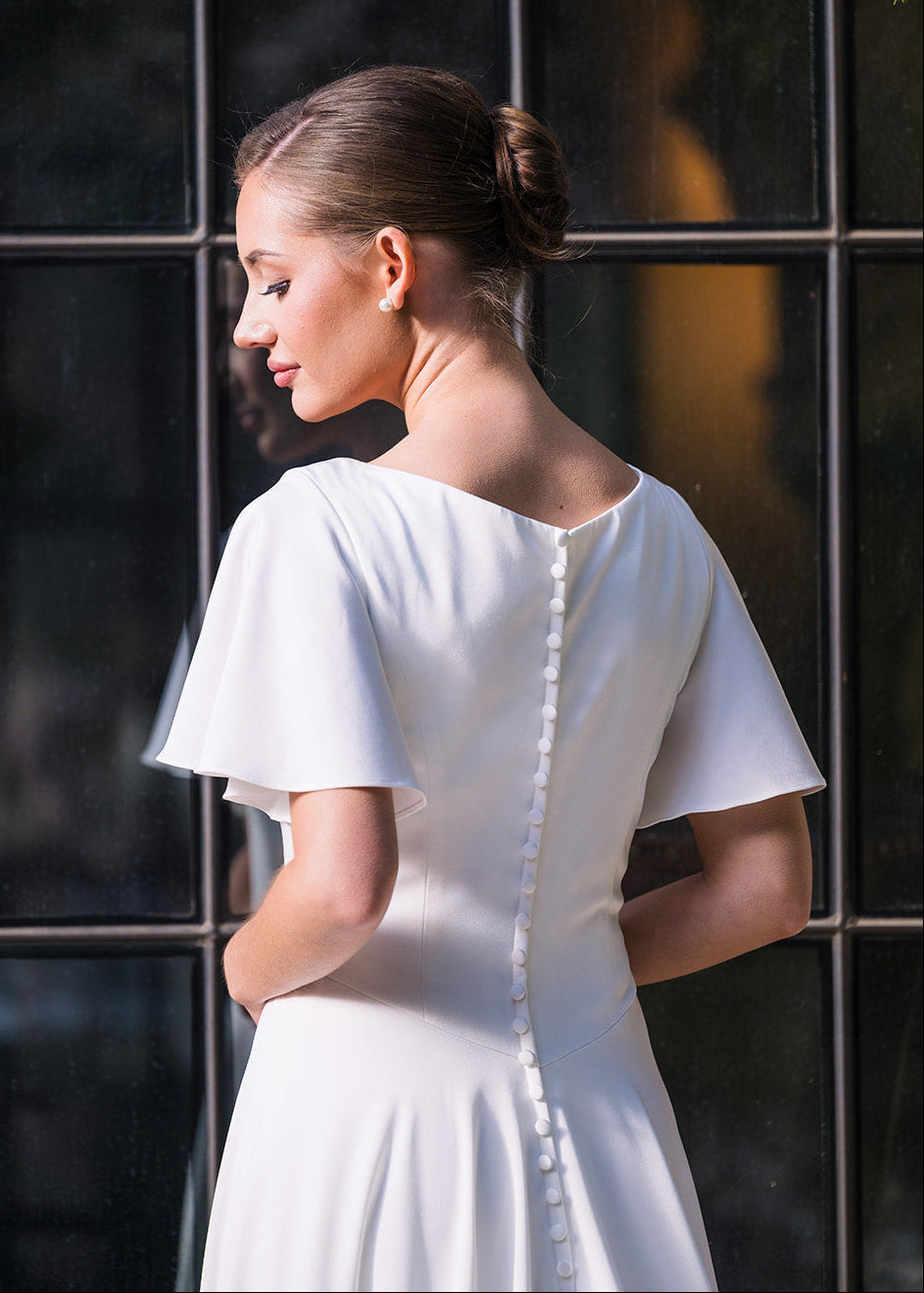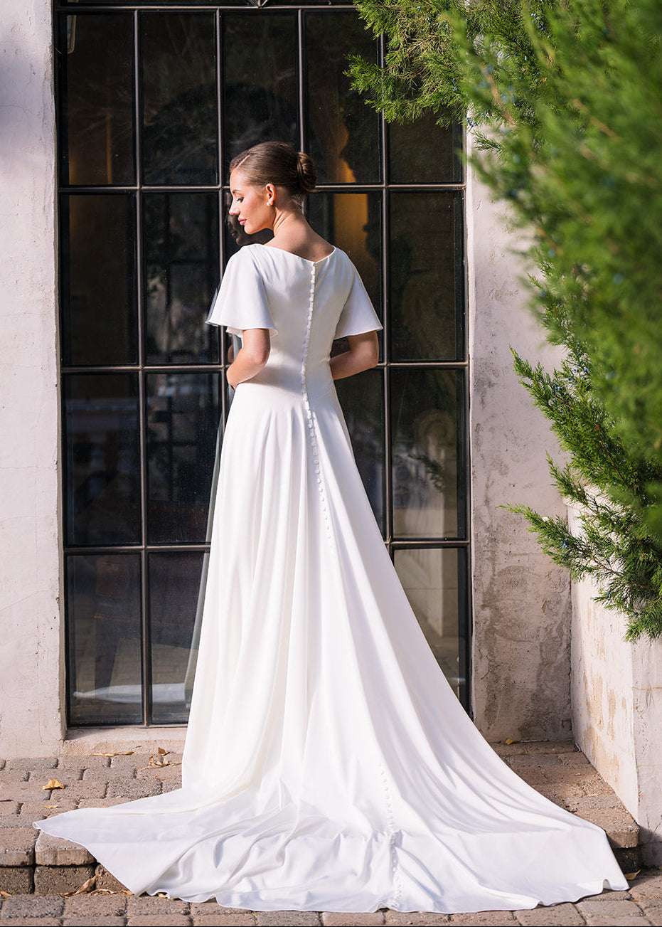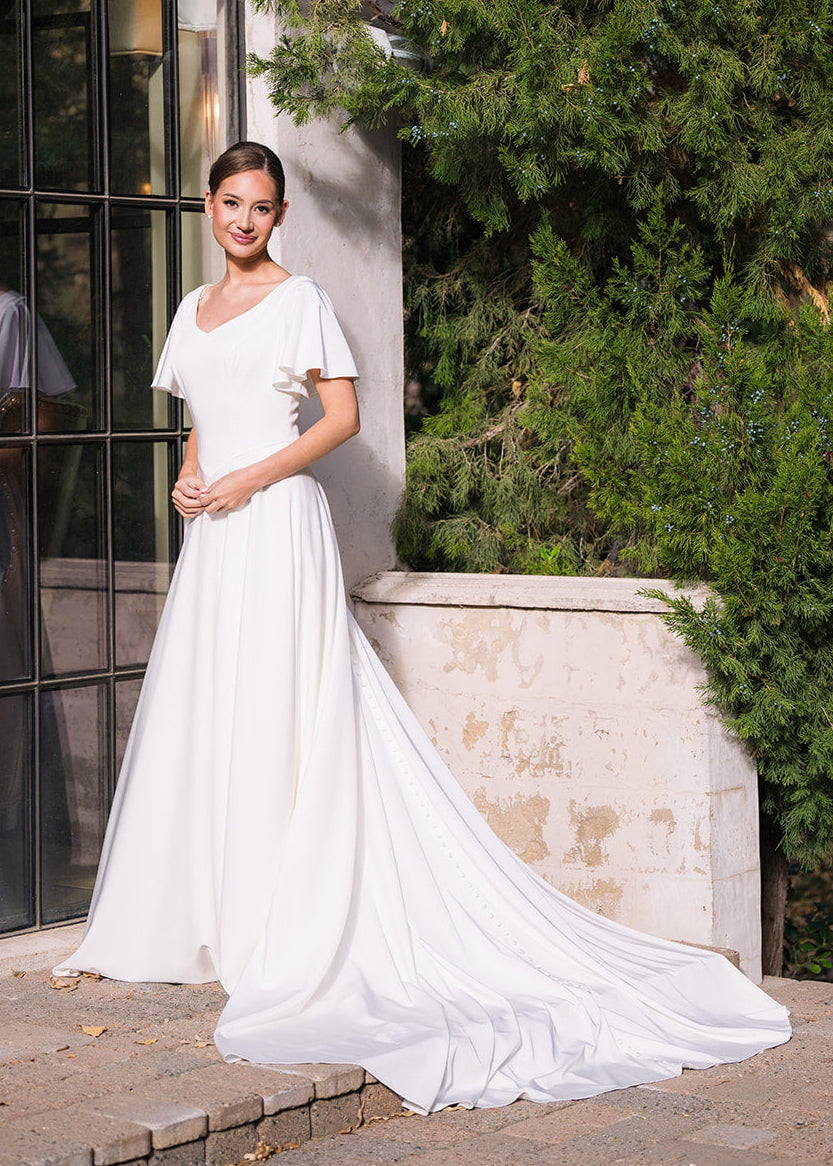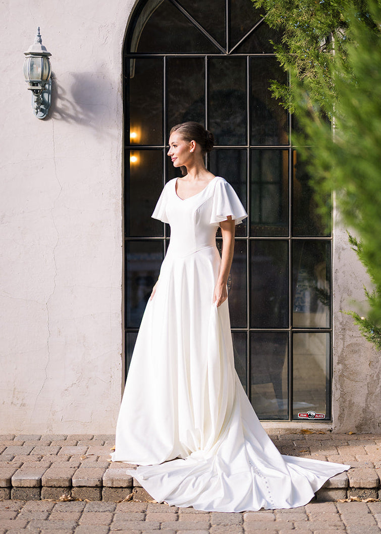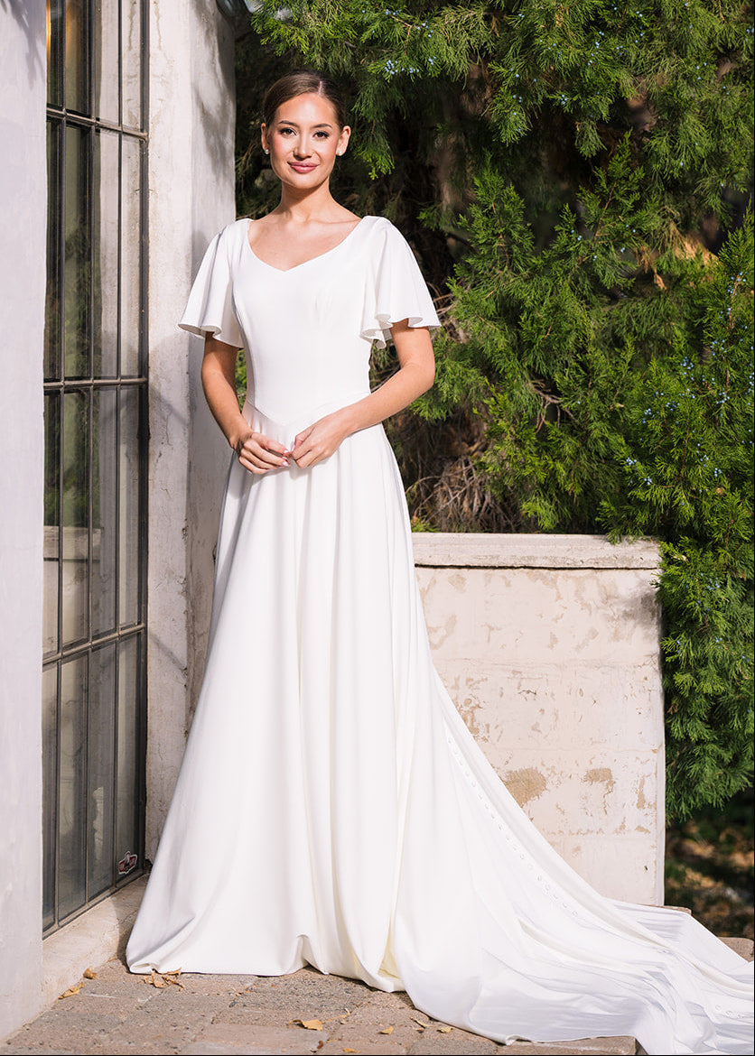 Michelle is a classic beauty. She is an a-line gown made of soft crepe with adorable flutter sleeves. She features a modest v-neckline, basque waist and buttons down the length of the train.