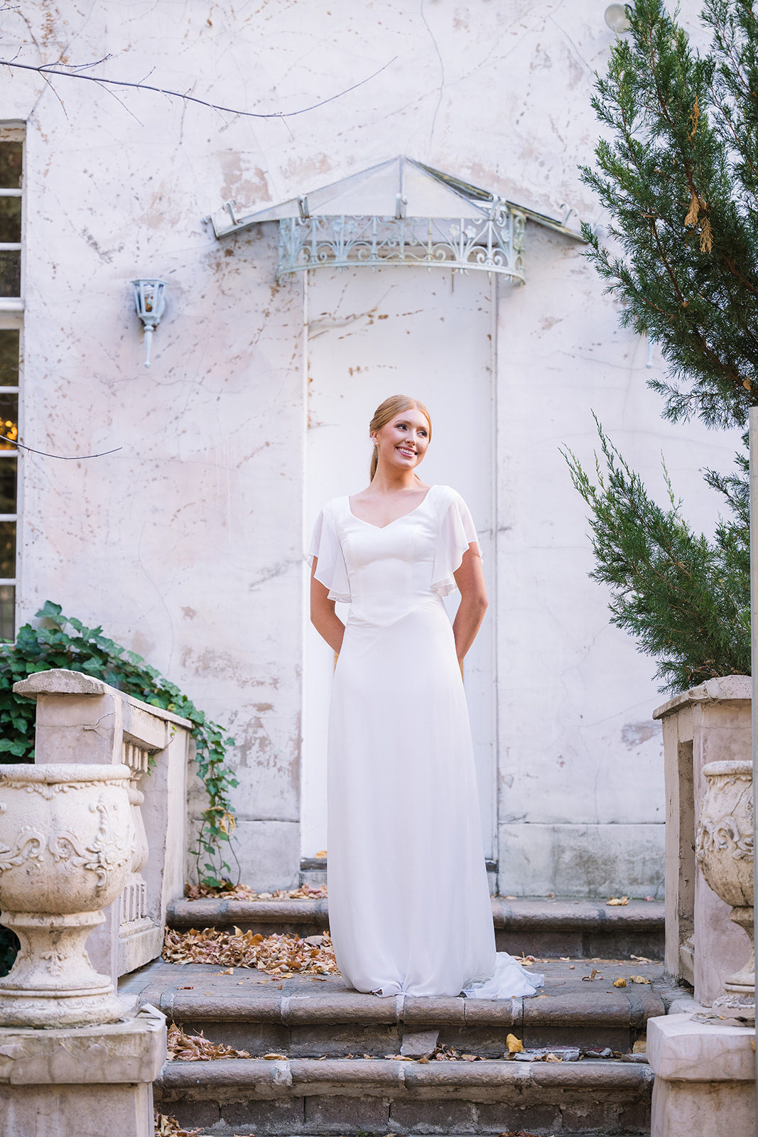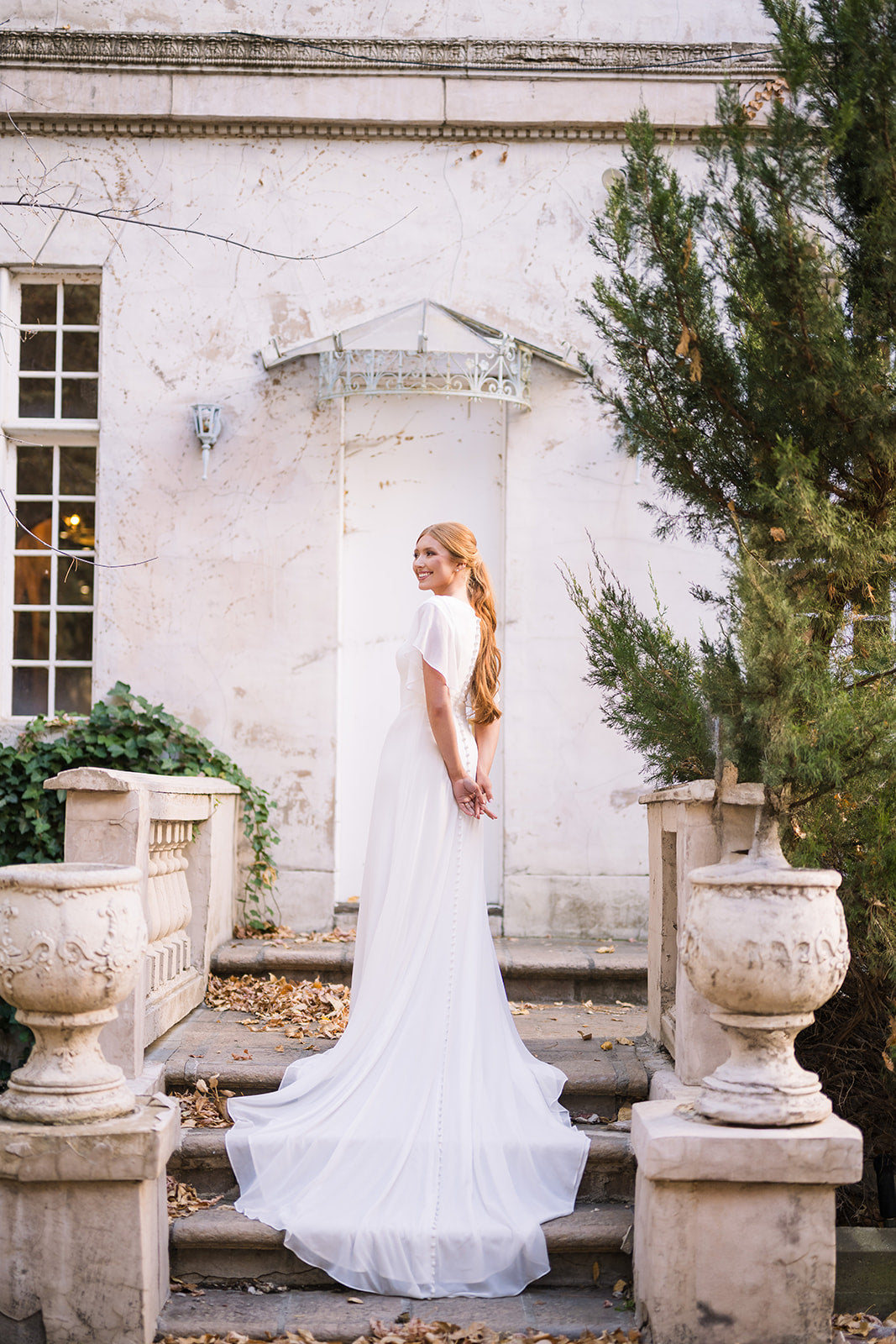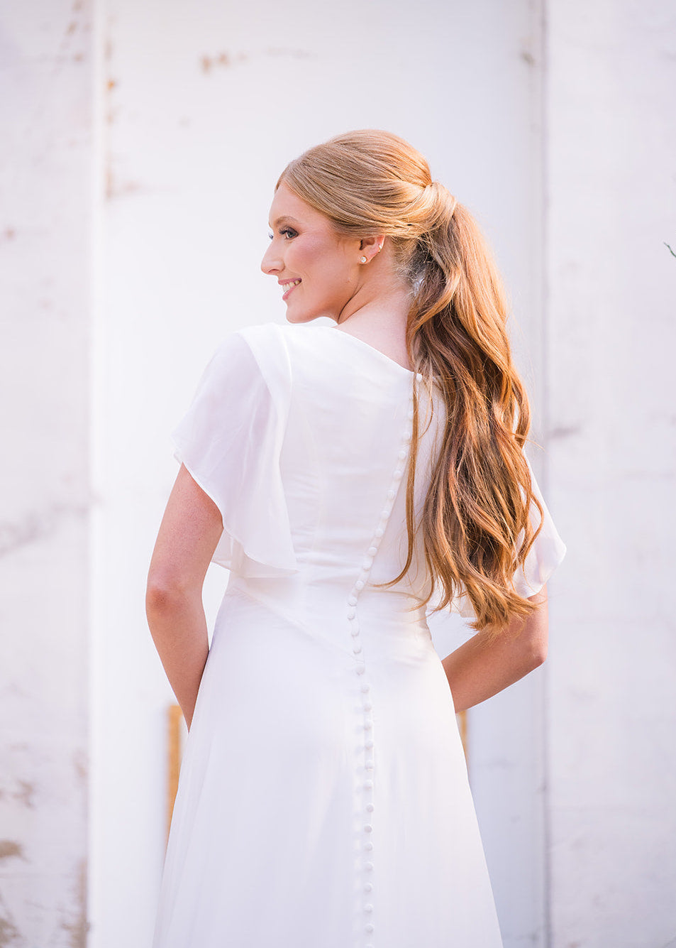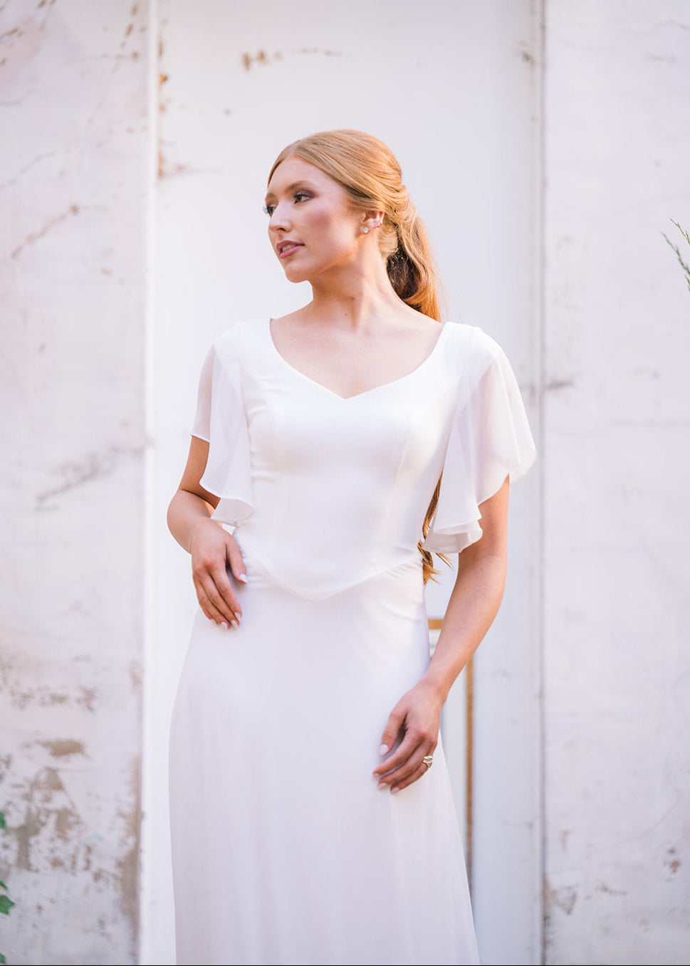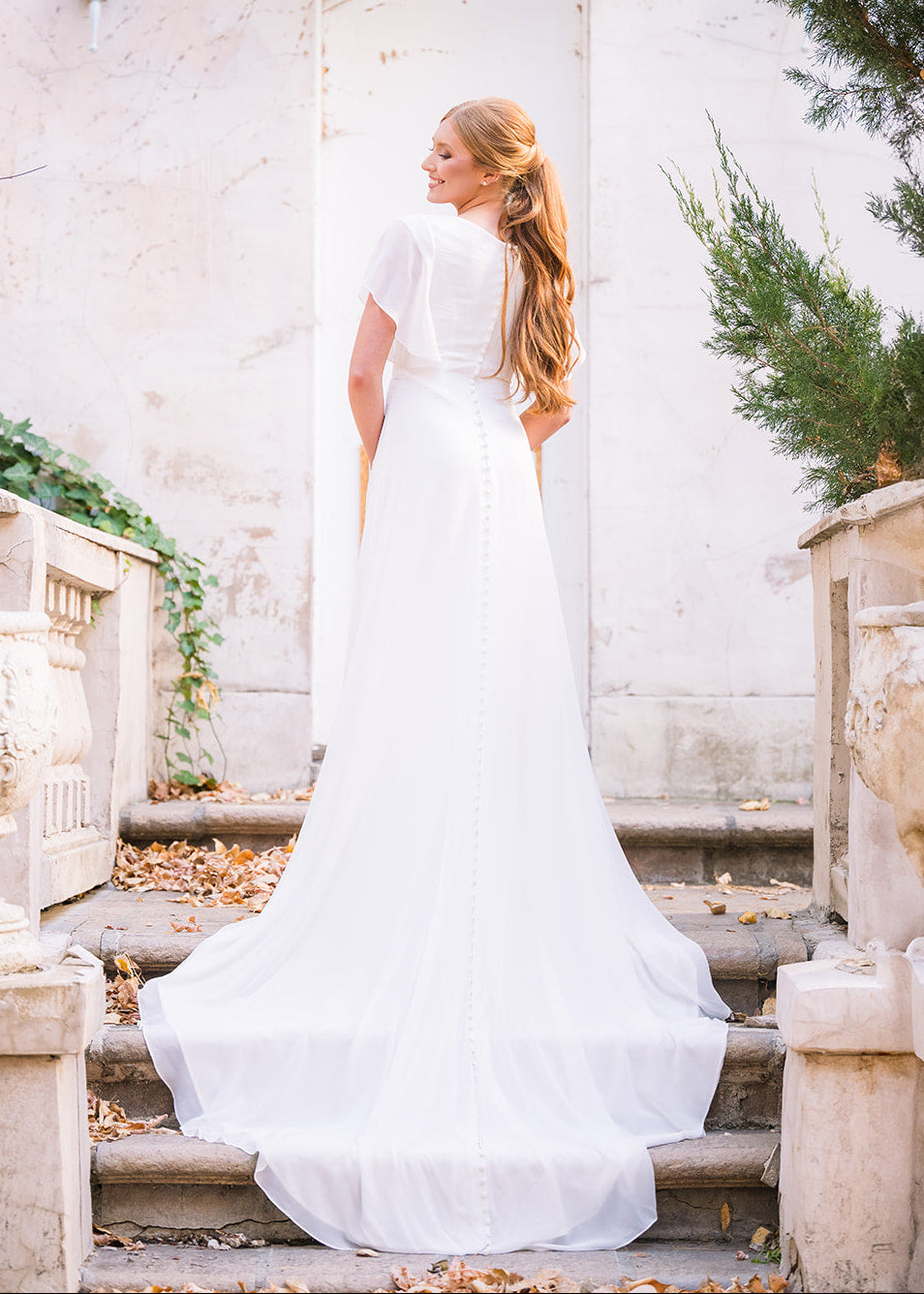 Molly is a flowing a-line silhouette made of chiffon. She features a modest wide v-neck, a basque waist, soft bishop sleeves and buttons down the length of the train. Fabric: ChiffonAvailable colors: Ivory, WhiteDress color in photographs: Ivory Find A Location To Buy