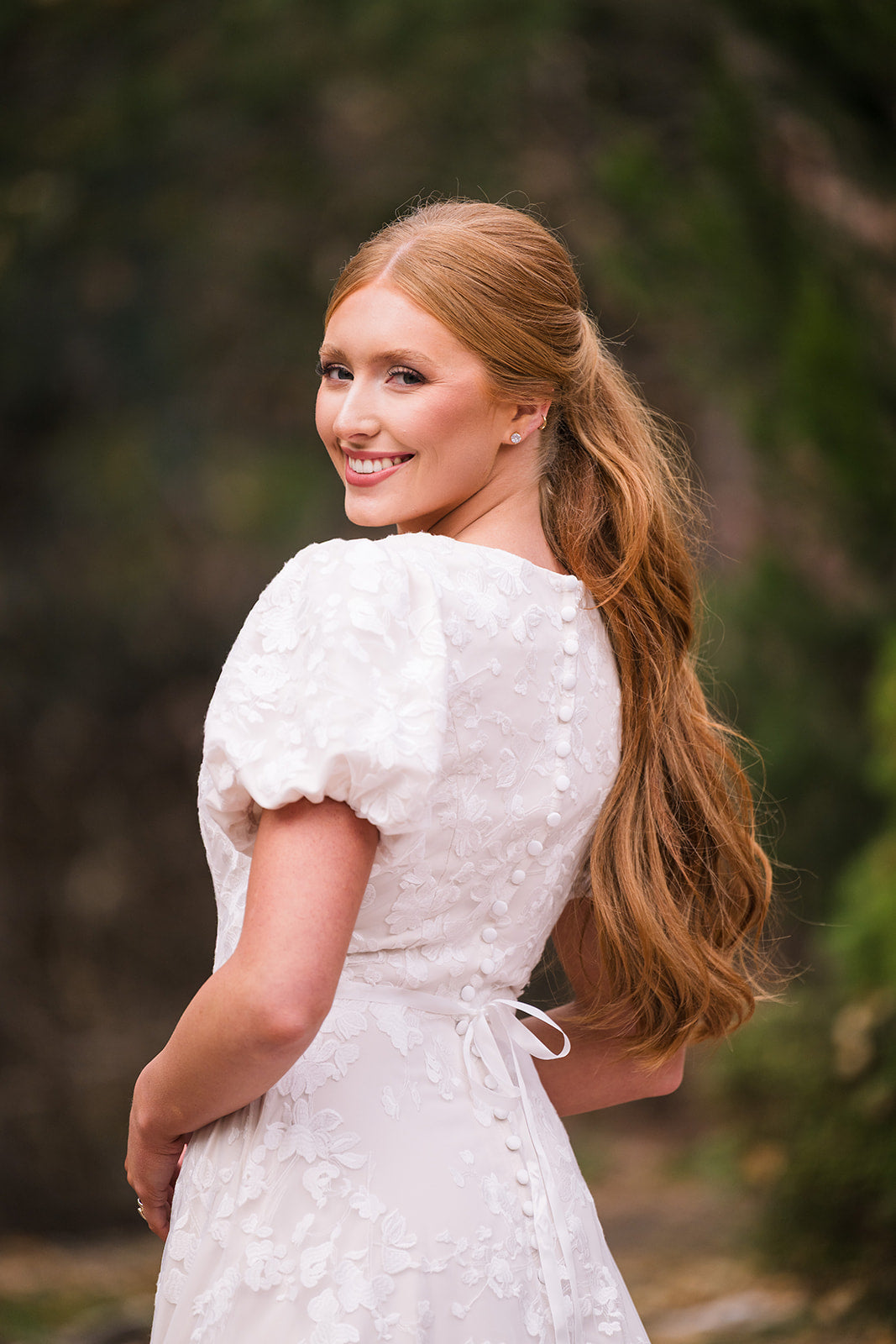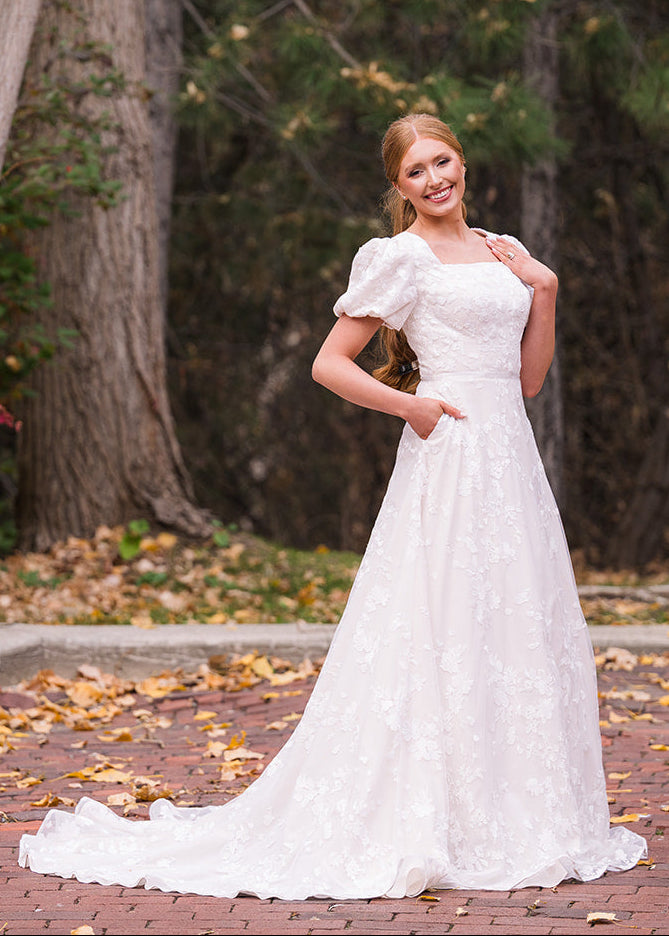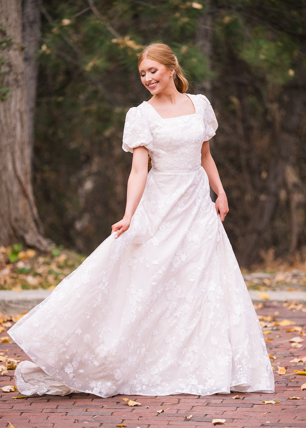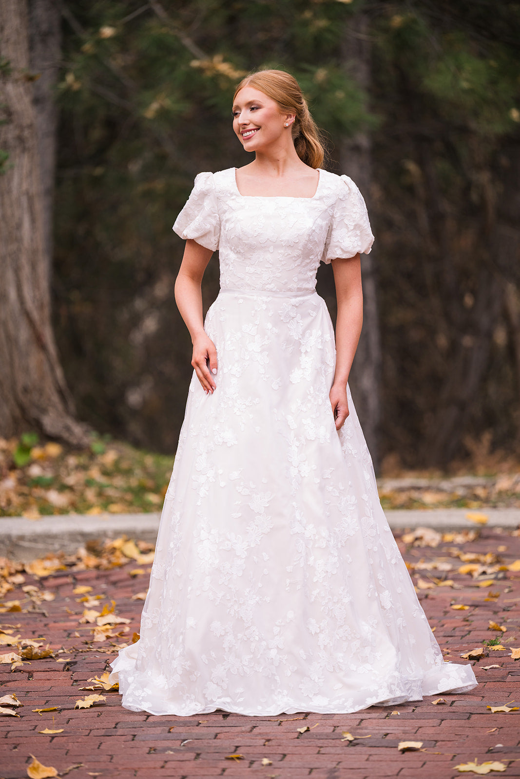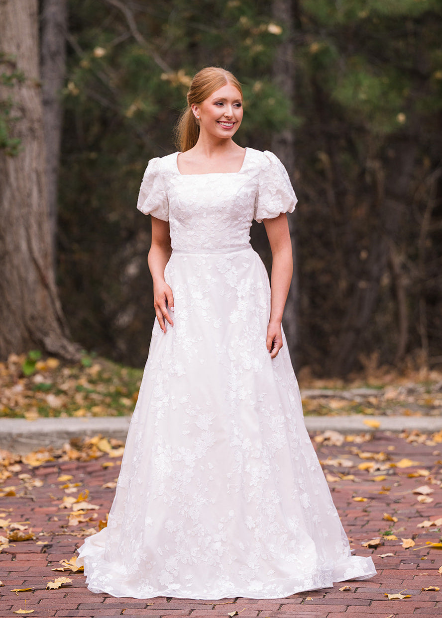 Shelby is a full A-line silhouette made of floral lace and adorned with a ribbon at the waist. She features a modest soft square neckline and lined puff sleeves. A beautiful, classic modest wedding dress.